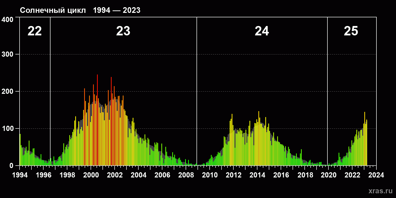 Среднемесячное число солнечных пятен (SSN) с января 1994 года по март 2023 года.
