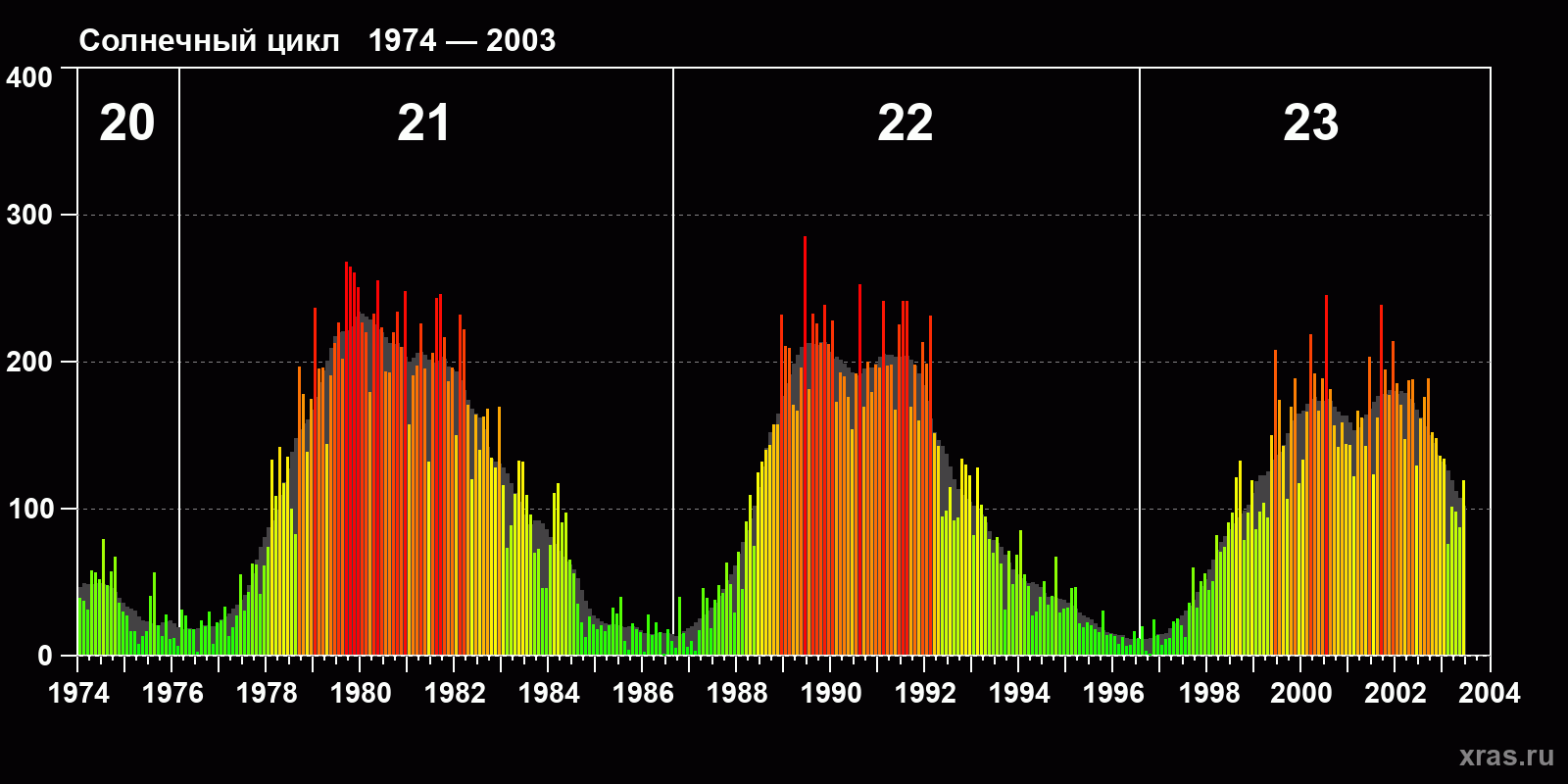 Среднемесячное число солнечных пятен (SSN) с января 1974 года по июнь 2003 года.