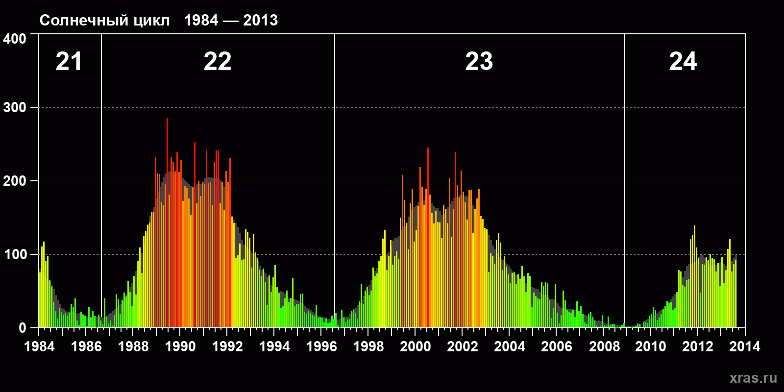 Среднемесячное число солнечных пятен (SSN) с января 1984 года по август 2013 года.