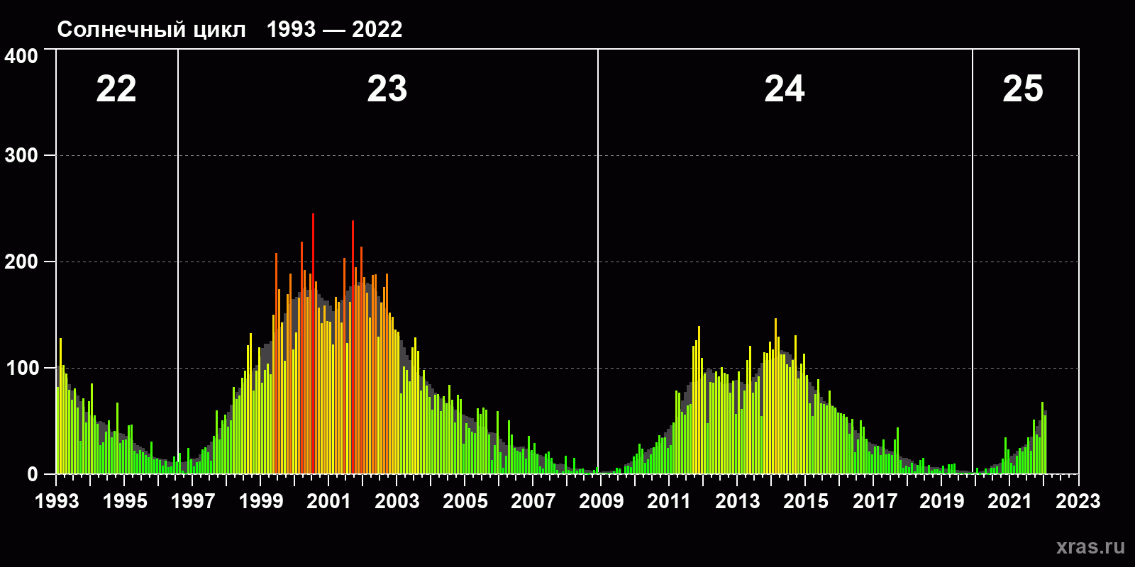 Среднемесячное число солнечных пятен (SSN) с января 1993 года по январь 2022 года.
