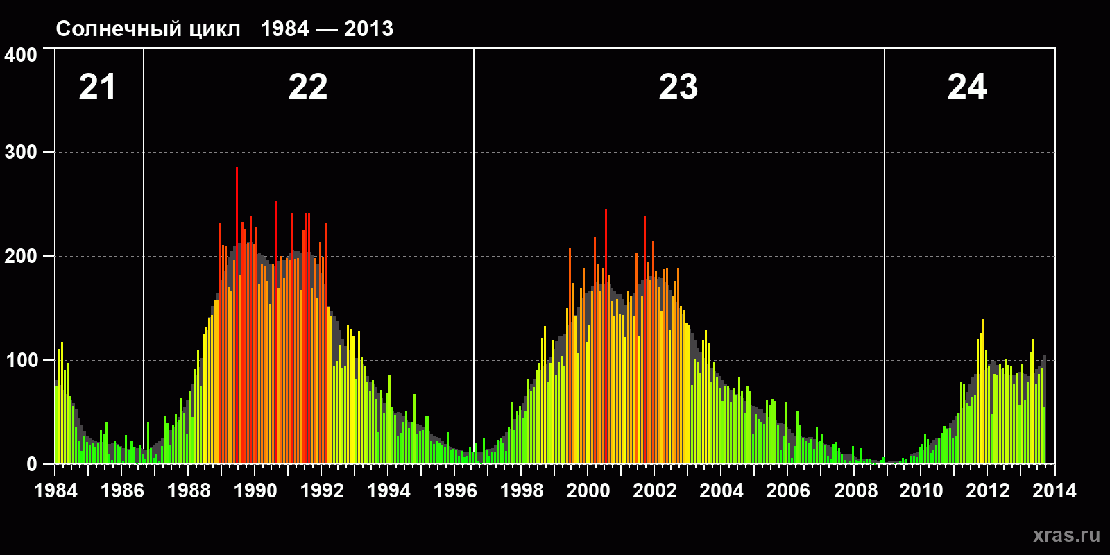 Среднемесячное число солнечных пятен (SSN) с января 1984 года по сентябрь 2013 года.