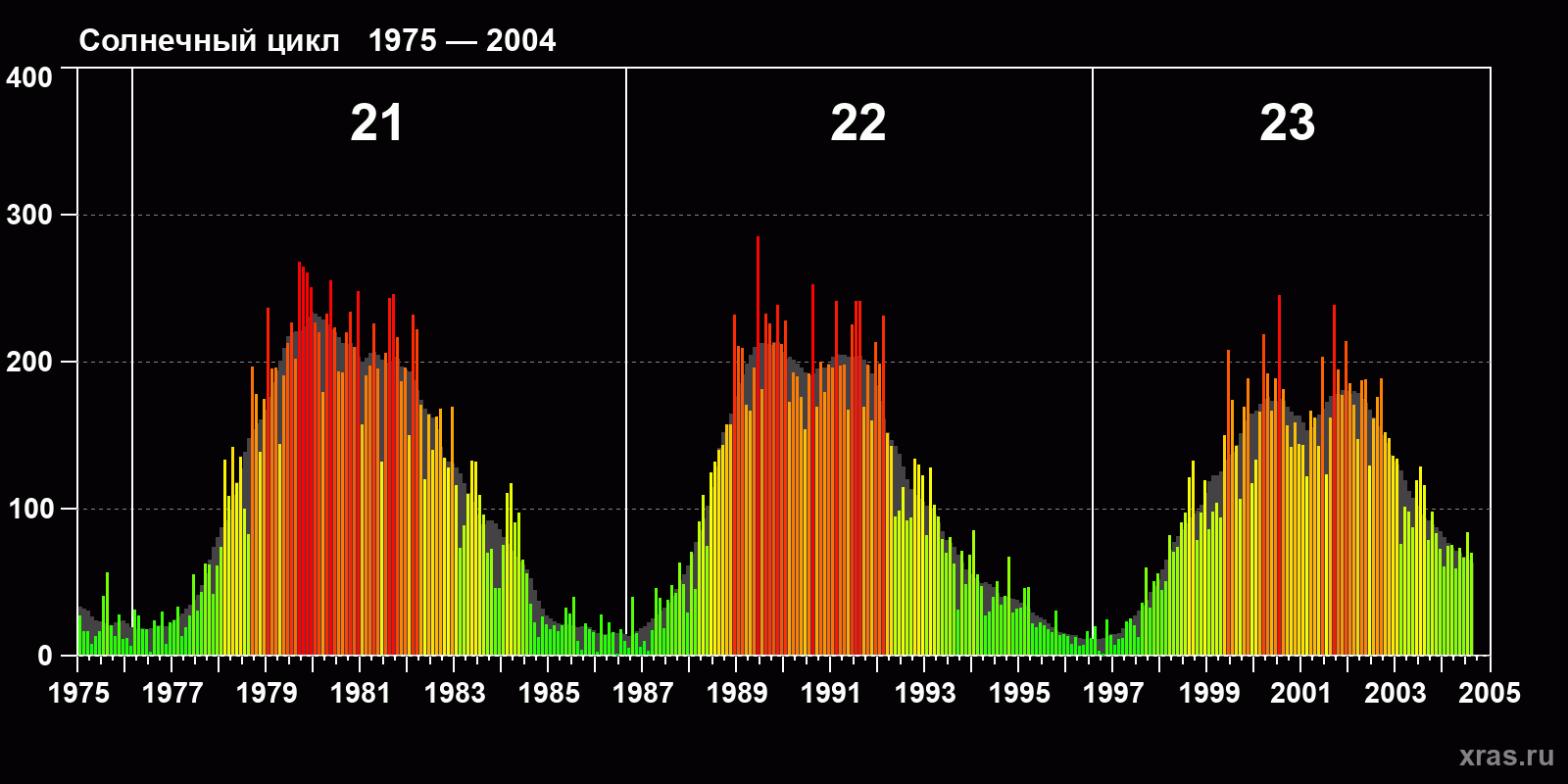 Среднемесячное число солнечных пятен (SSN) с января 1975 года по август 2004 года.