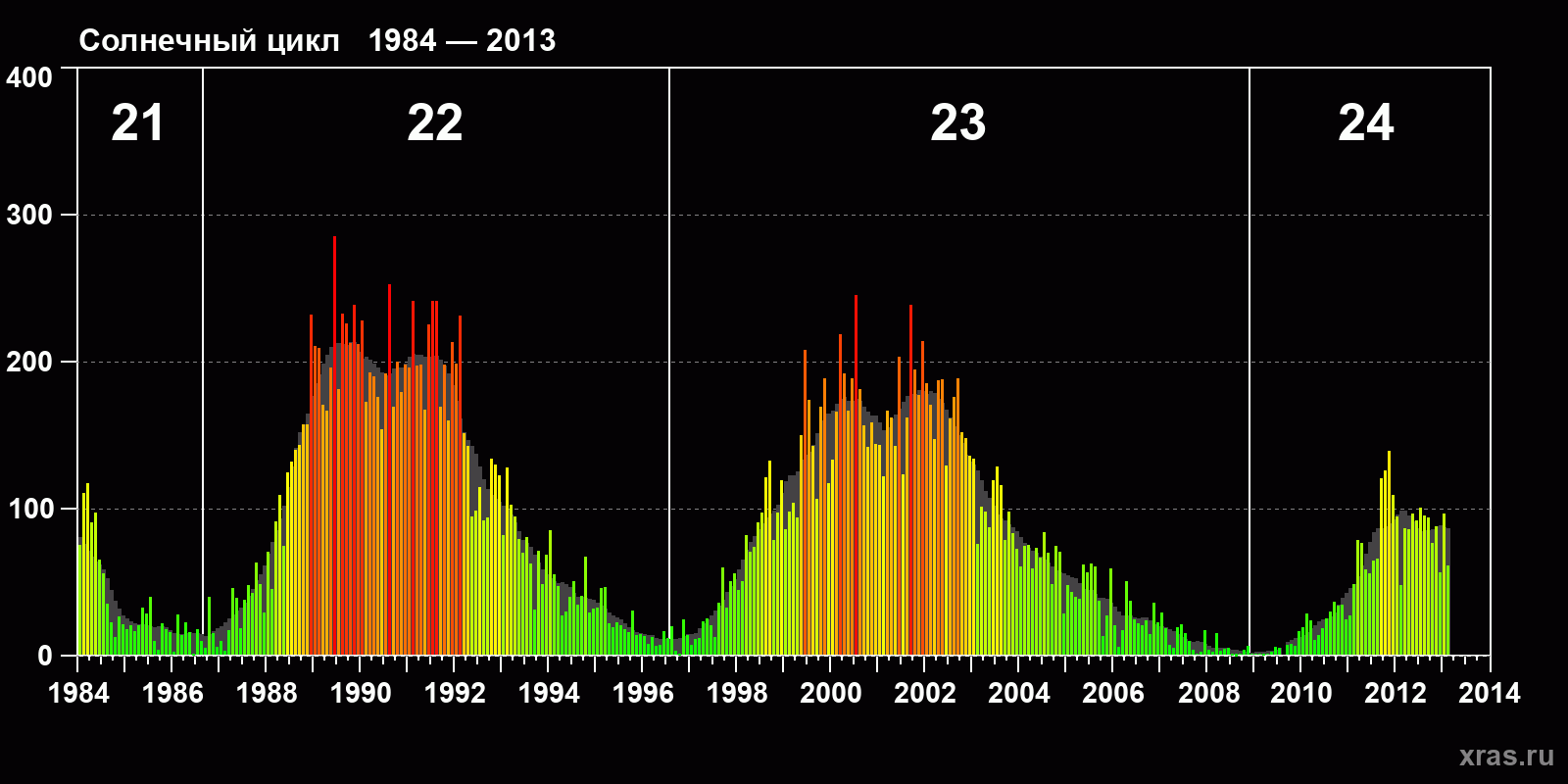 Среднемесячное число солнечных пятен (SSN) с января 1984 года по февраль 2013 года.