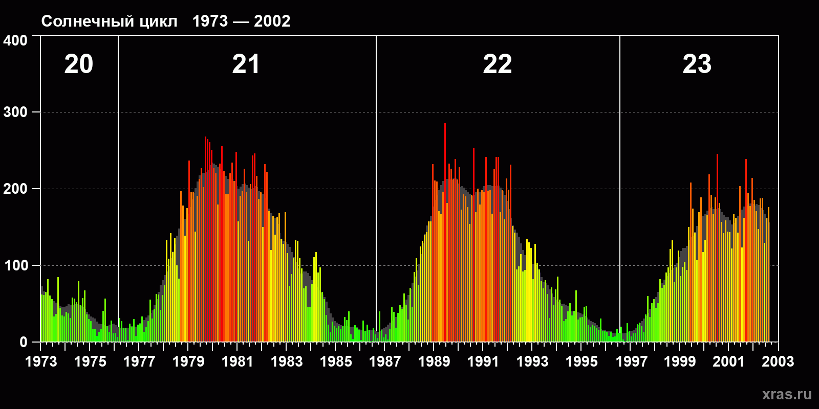 Среднемесячное число солнечных пятен (SSN) с января 1973 года по август 2002 года.