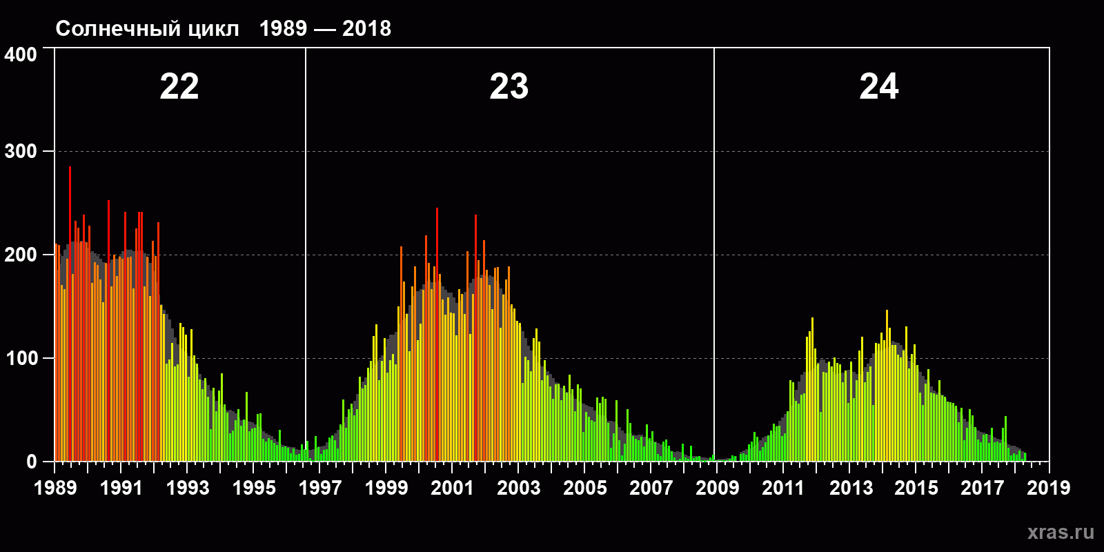 Среднемесячное число солнечных пятен (SSN) с января 1989 года по апрель 2018 года.