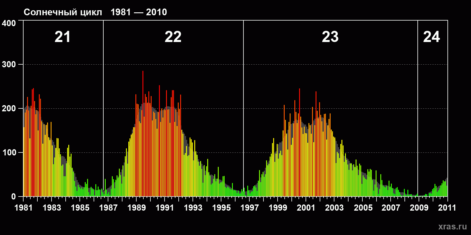 Среднемесячное число солнечных пятен (SSN) с января 1981 года по декабрь 2010 года.
