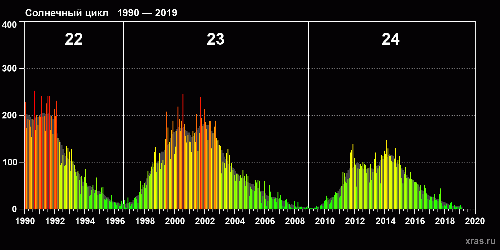 Серый фон — усреднённый солнечный цикл.