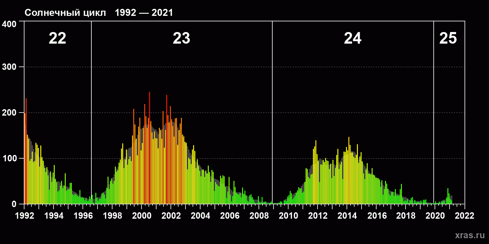 Среднемесячное число солнечных пятен (SSN) с января 1992 года по февраль 2021 года.