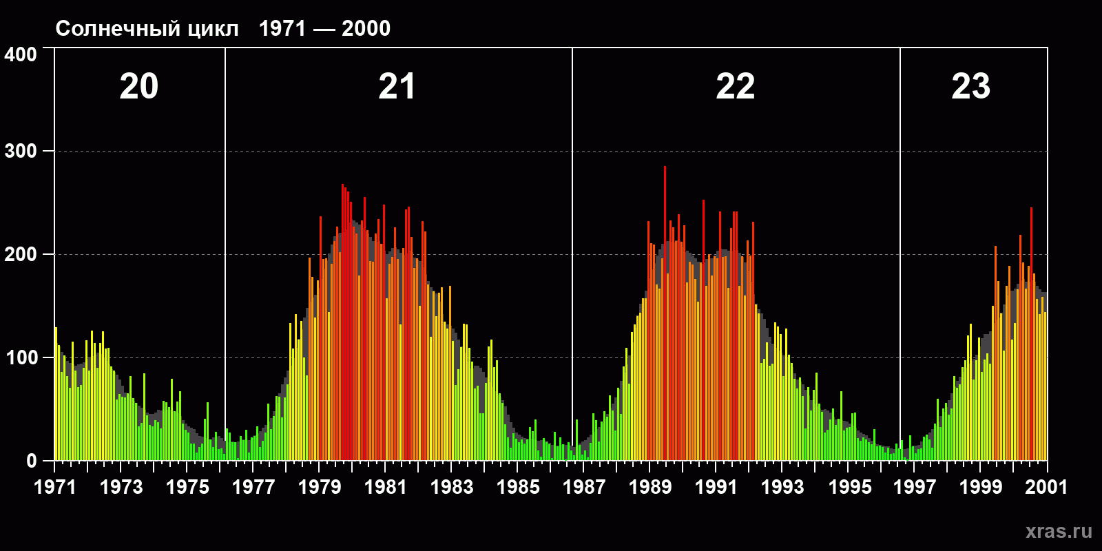 Среднемесячное число солнечных пятен (SSN) с января 1971 года по декабрь 2000 года.