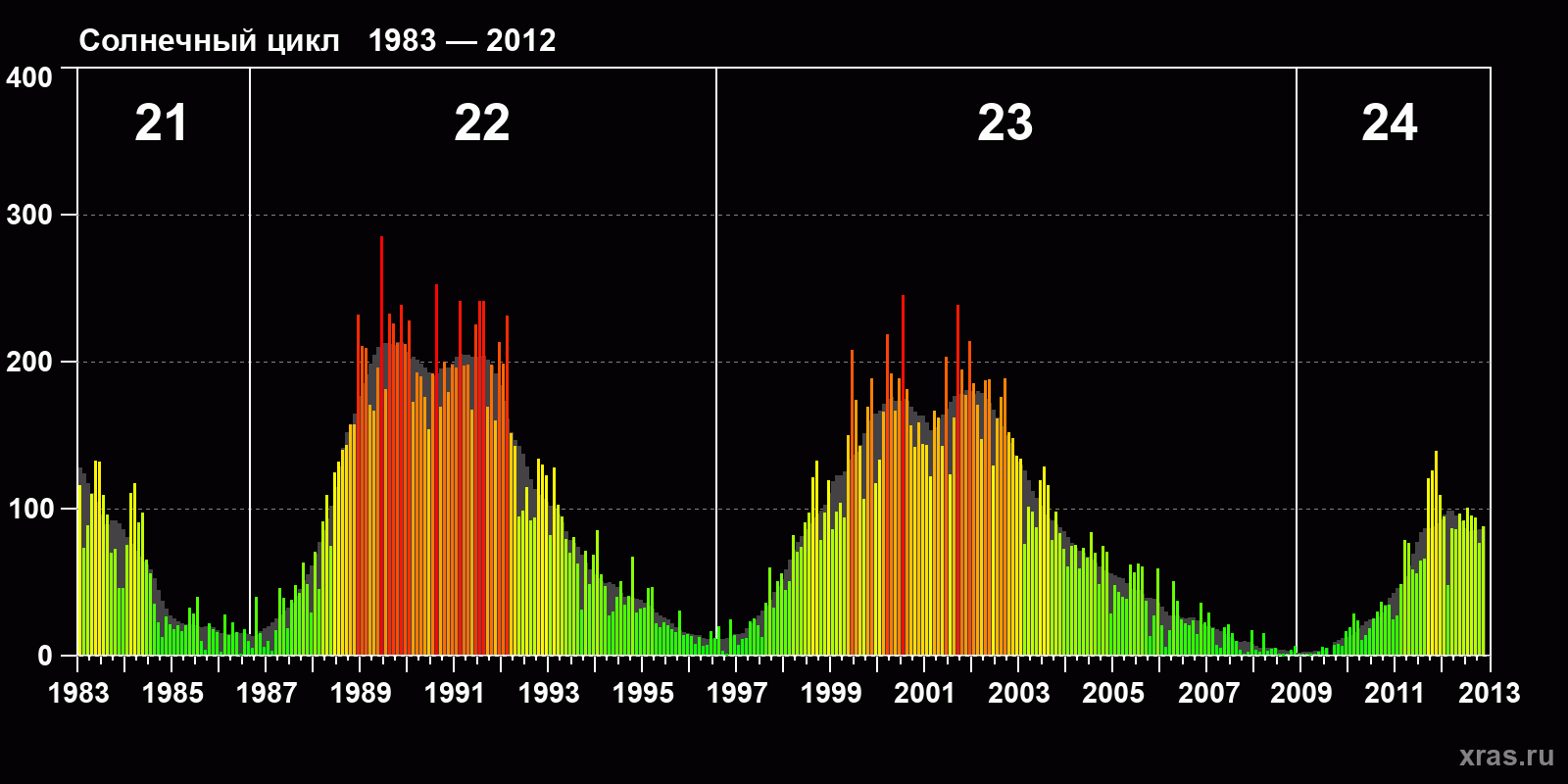Среднемесячное число солнечных пятен (SSN) с января 1983 года по ноябрь 2012 года.