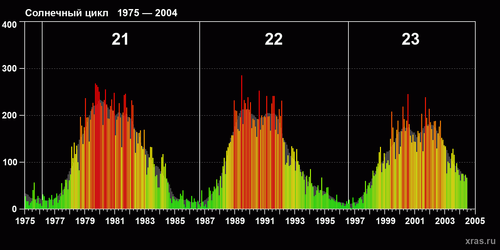 Среднемесячное число солнечных пятен (SSN) с января 1975 года по июнь 2004 года.