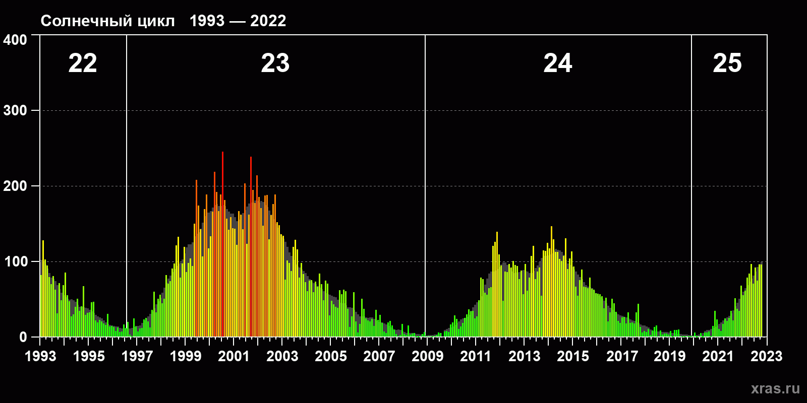 Среднемесячное число солнечных пятен (SSN) с января 1993 года по октябрь 2022 года.