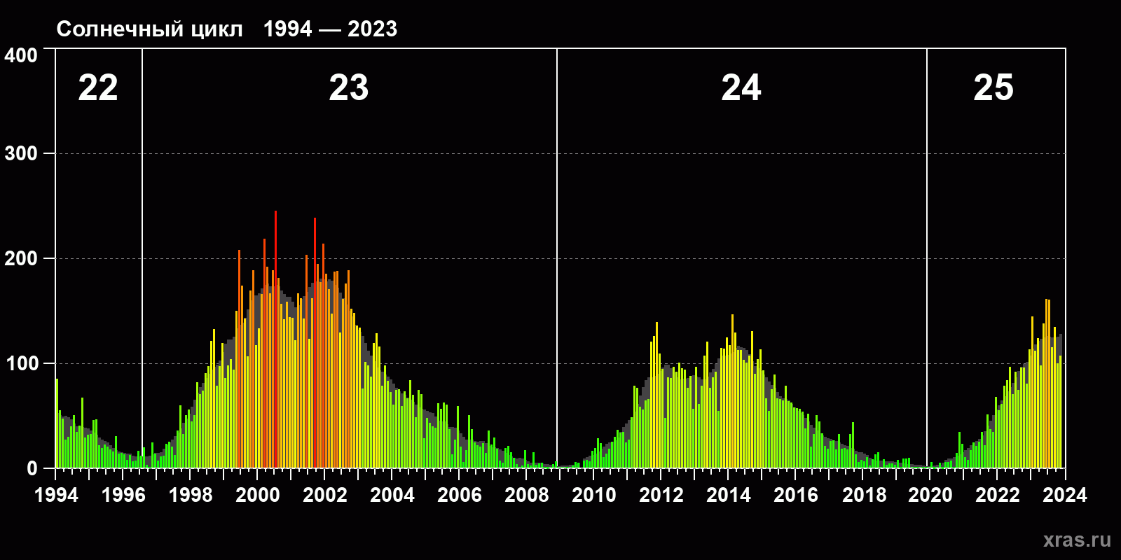 Среднемесячное число солнечных пятен (SSN) с января 1994 года по ноябрь 2023 года.