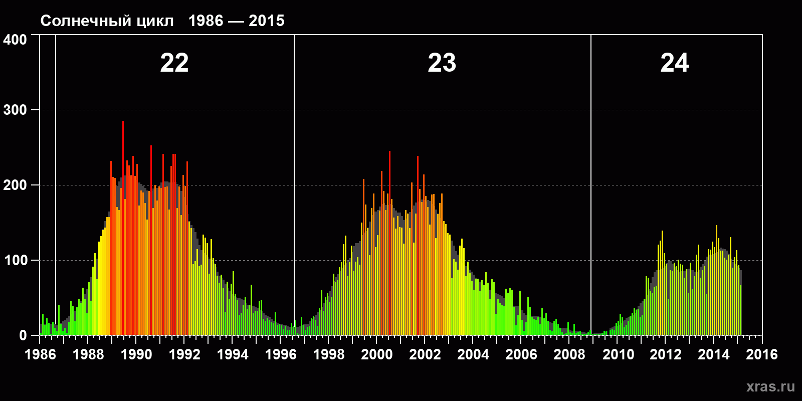 Среднемесячное число солнечных пятен (SSN) с января 1986 года по февраль 2015 года.