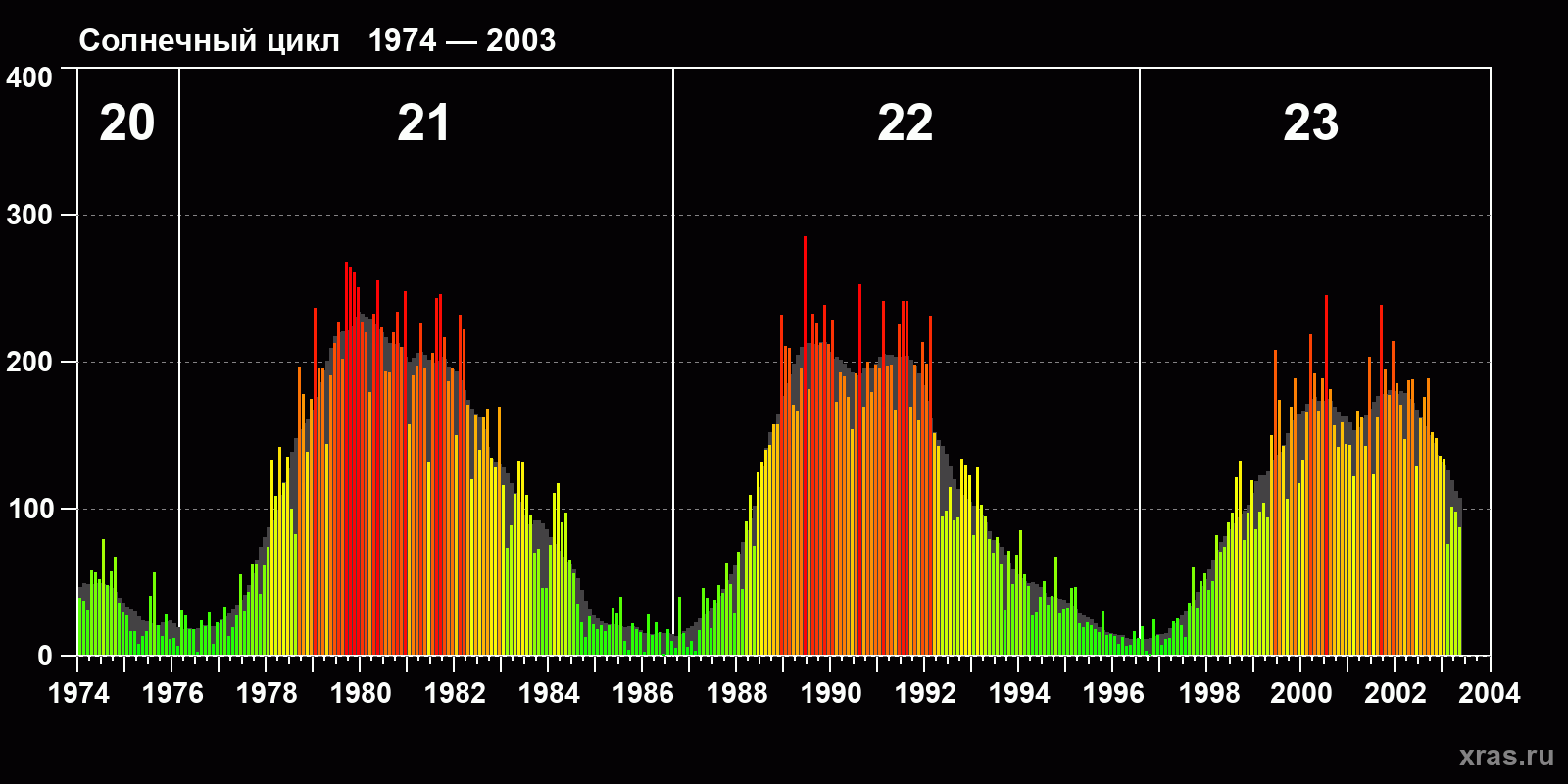 Среднемесячное число солнечных пятен (SSN) с января 1974 года по май 2003 года.