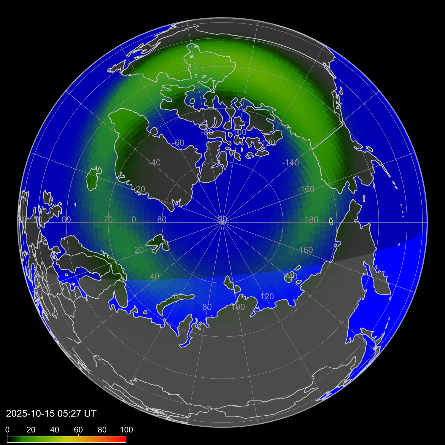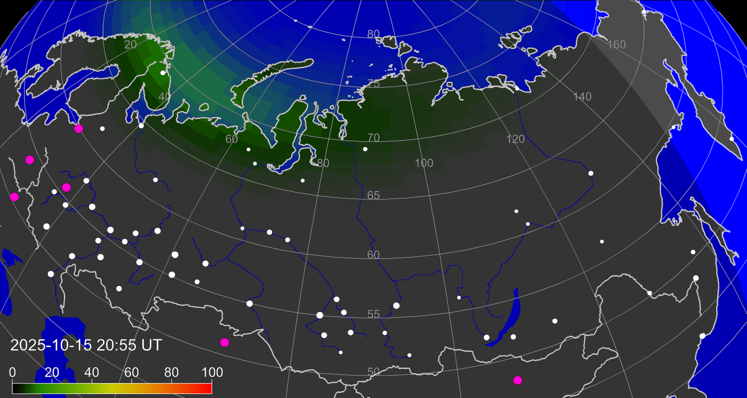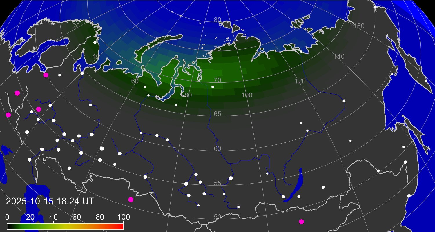 Изменения и часовой прогноз индекса интенсивности полярных сияний с 2025-10-15 по 2025-10-16