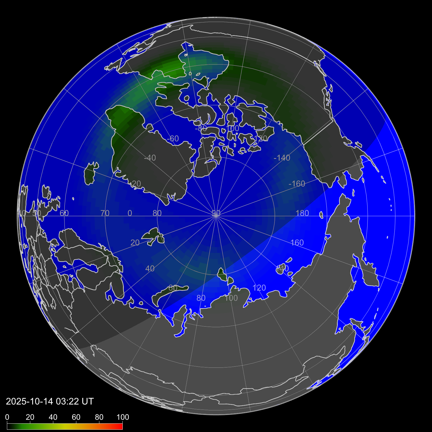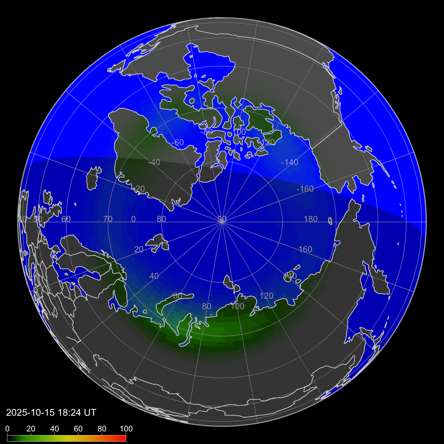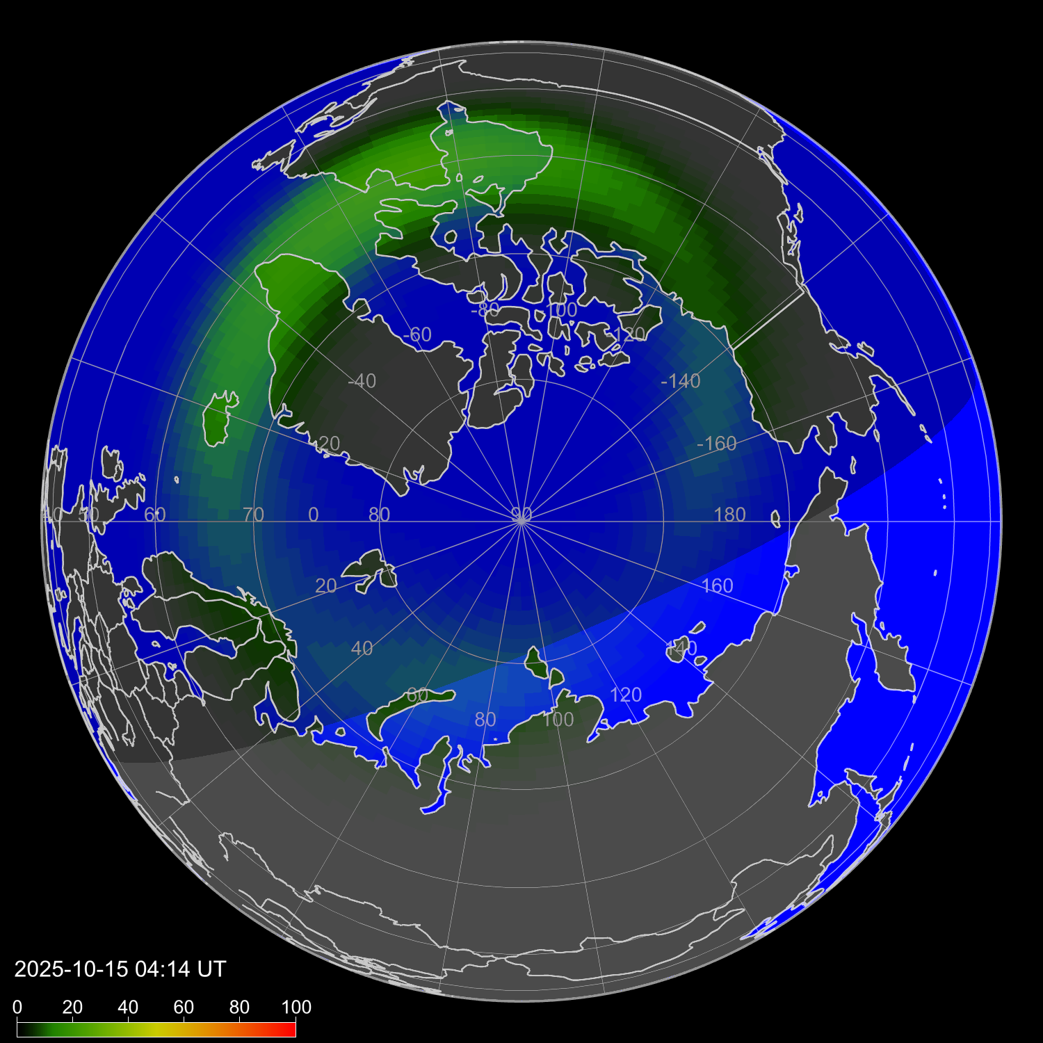 Изменения и часовой прогноз индекса интенсивности полярных сияний с 2025-10-15 по 2025-10-16