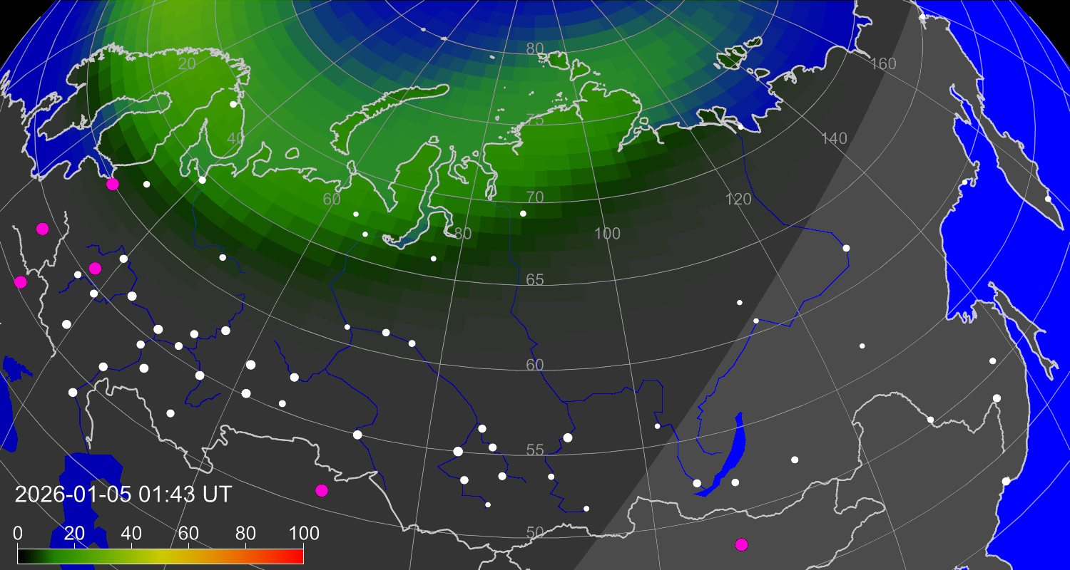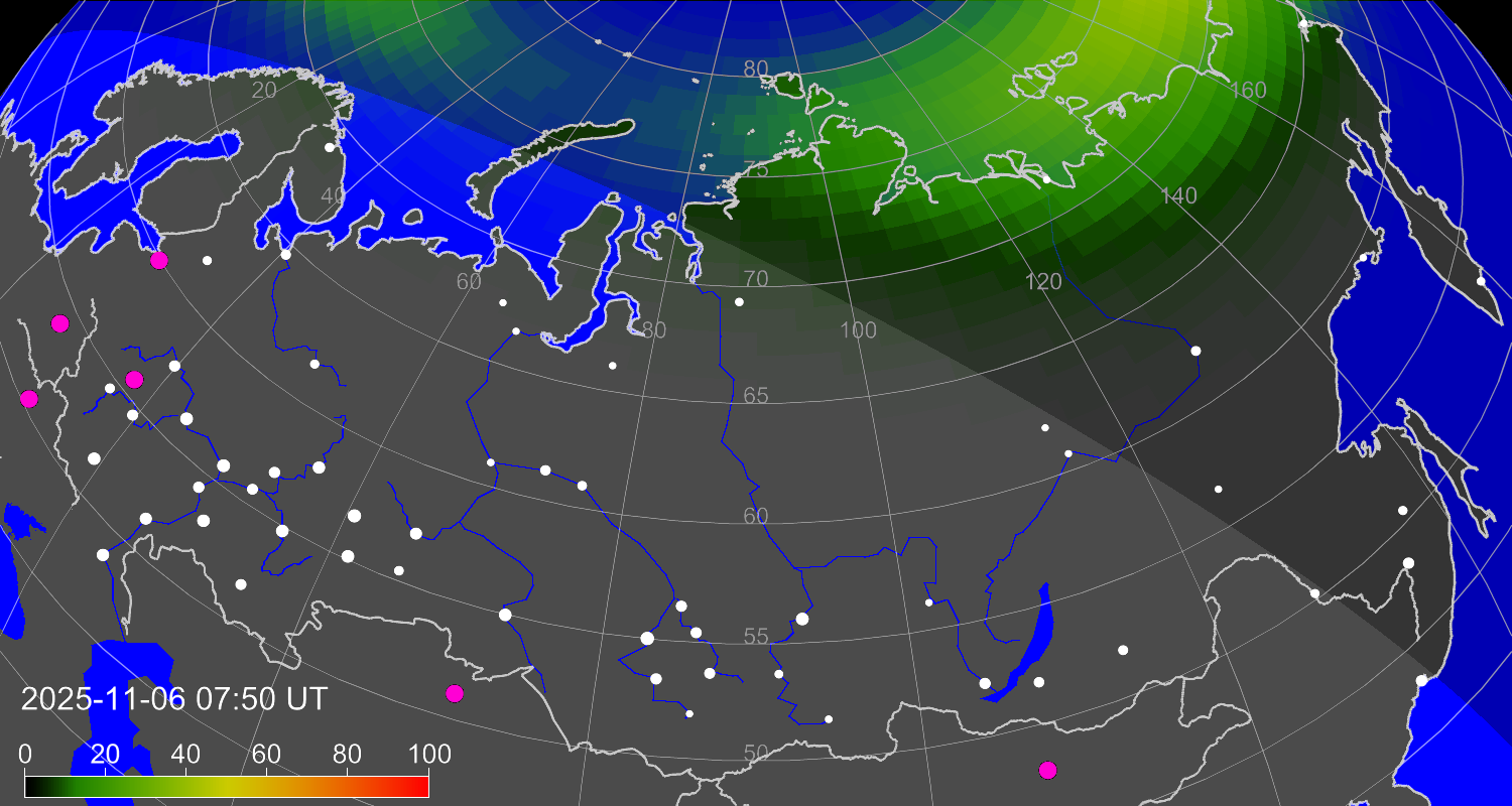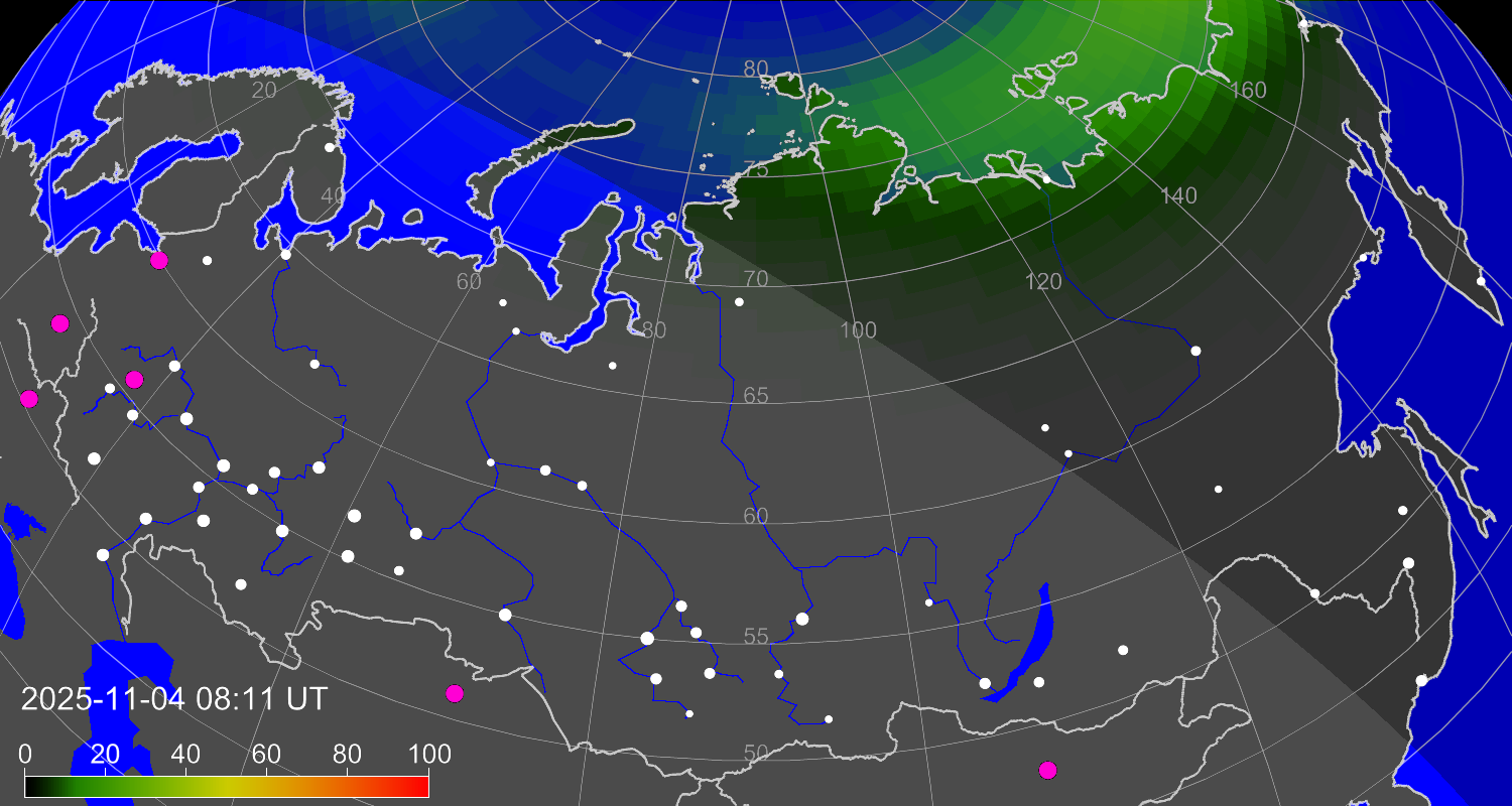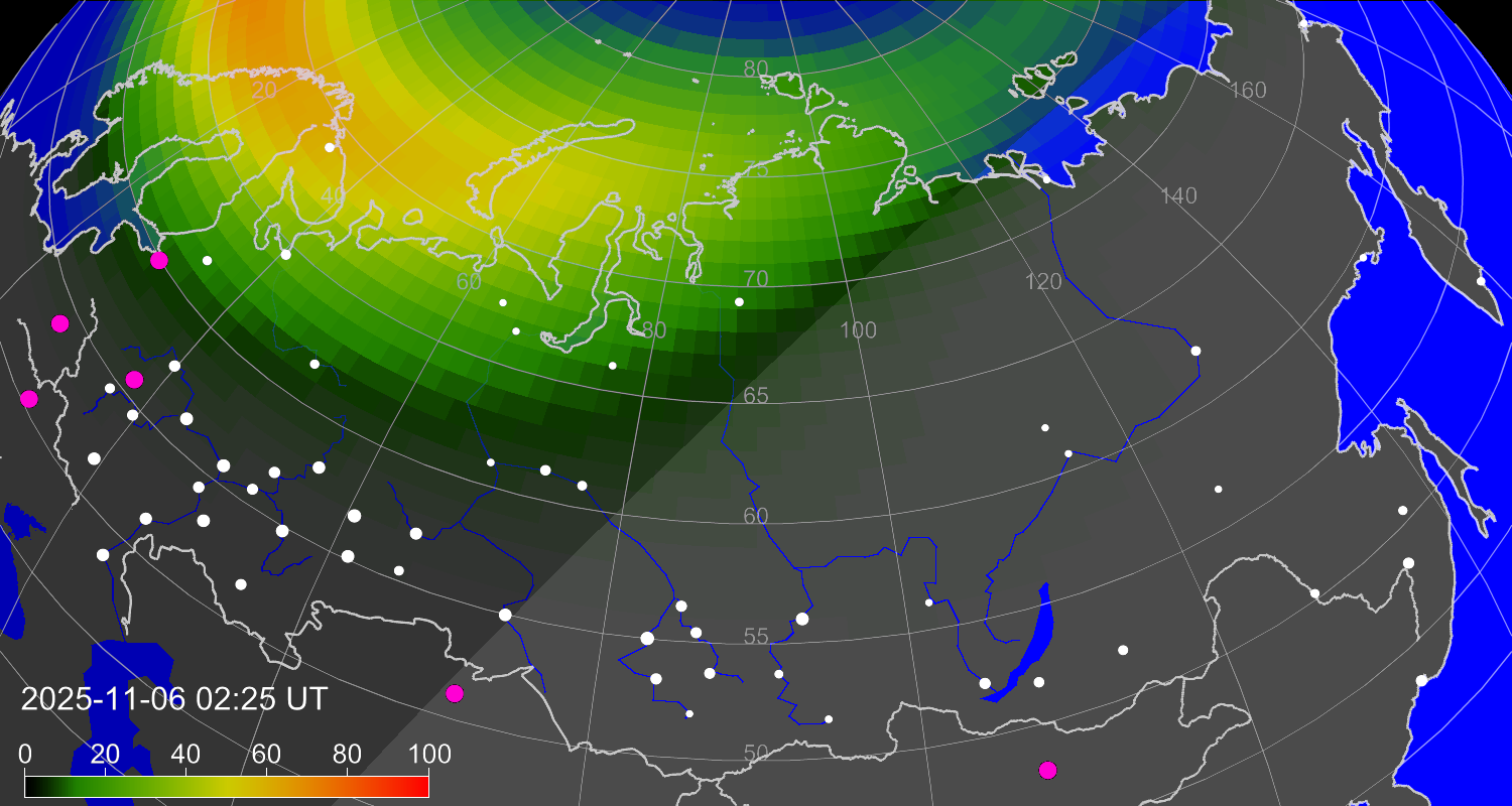 Индекс интенсивности полярных сияний и теоретически возможная широта наблюдений для ночного времени в восточном полушарии