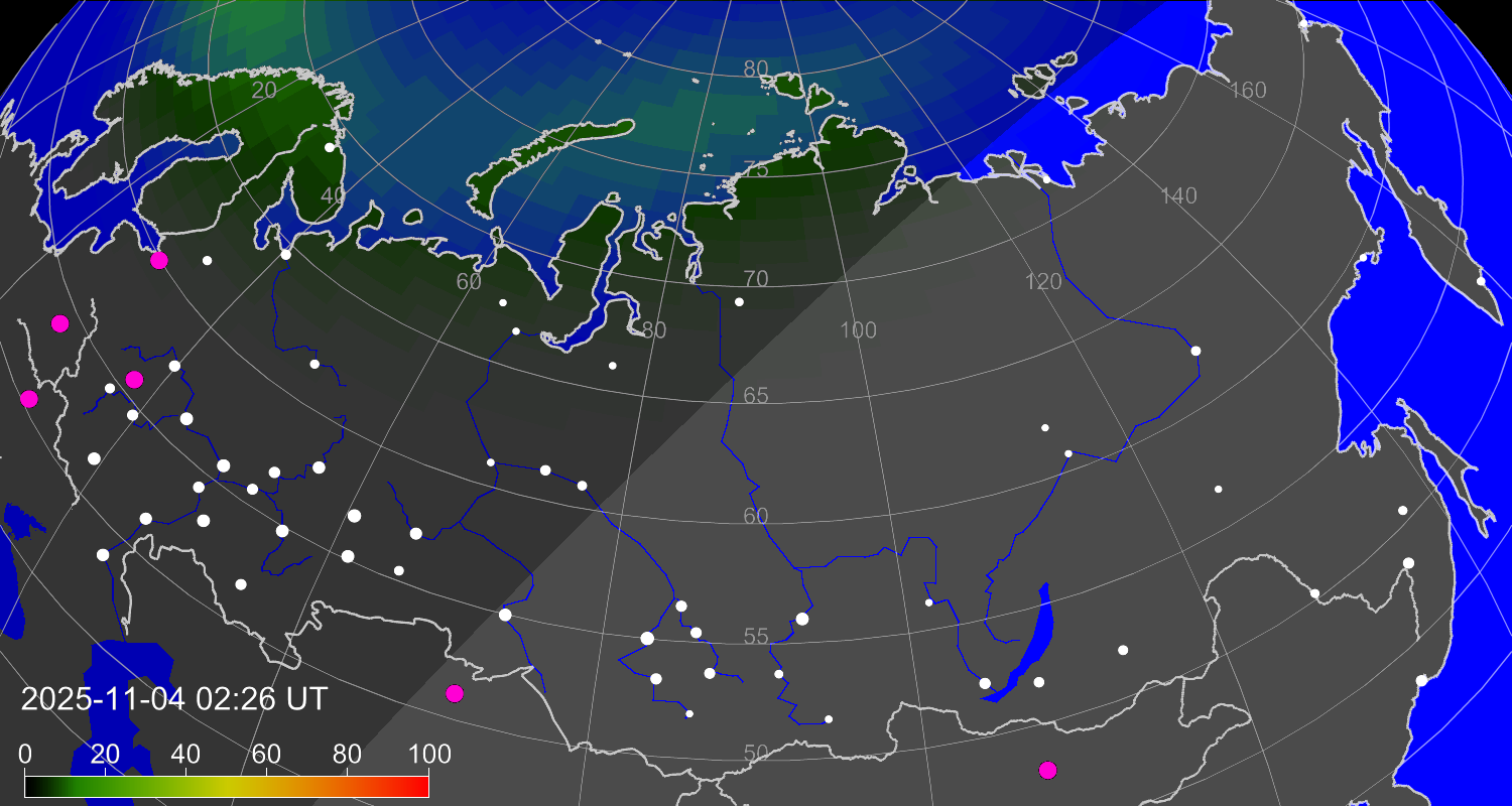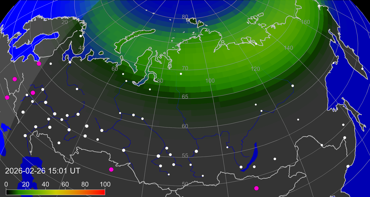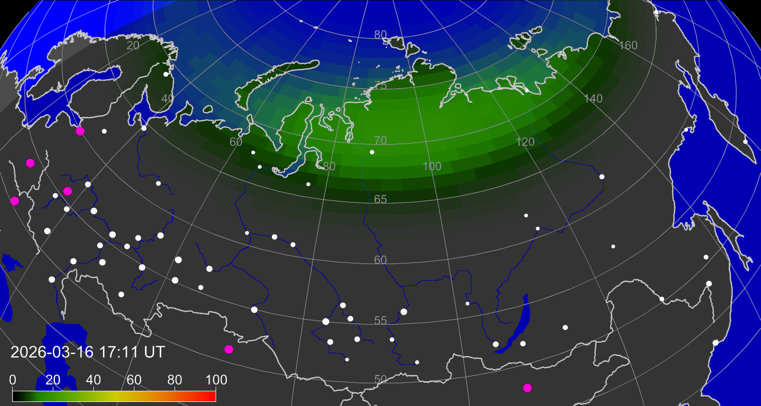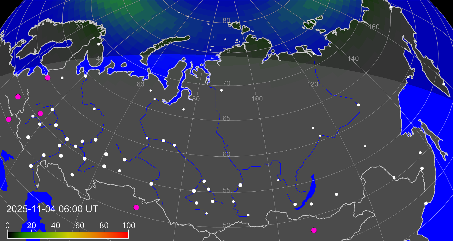 Индекс интенсивности полярных сияний и теоретически возможная широта наблюдений для ночного времени в восточном полушарии