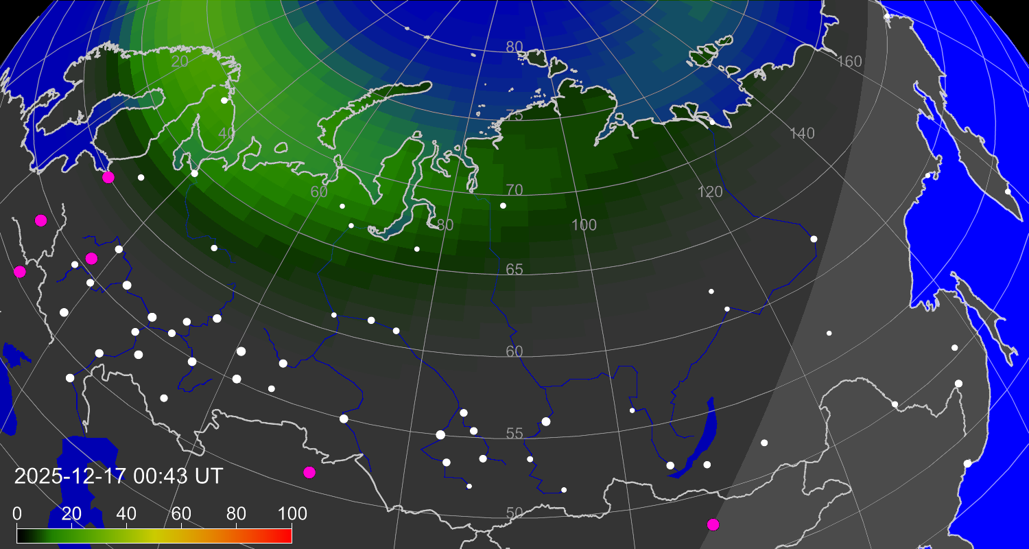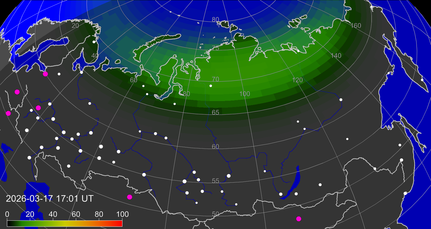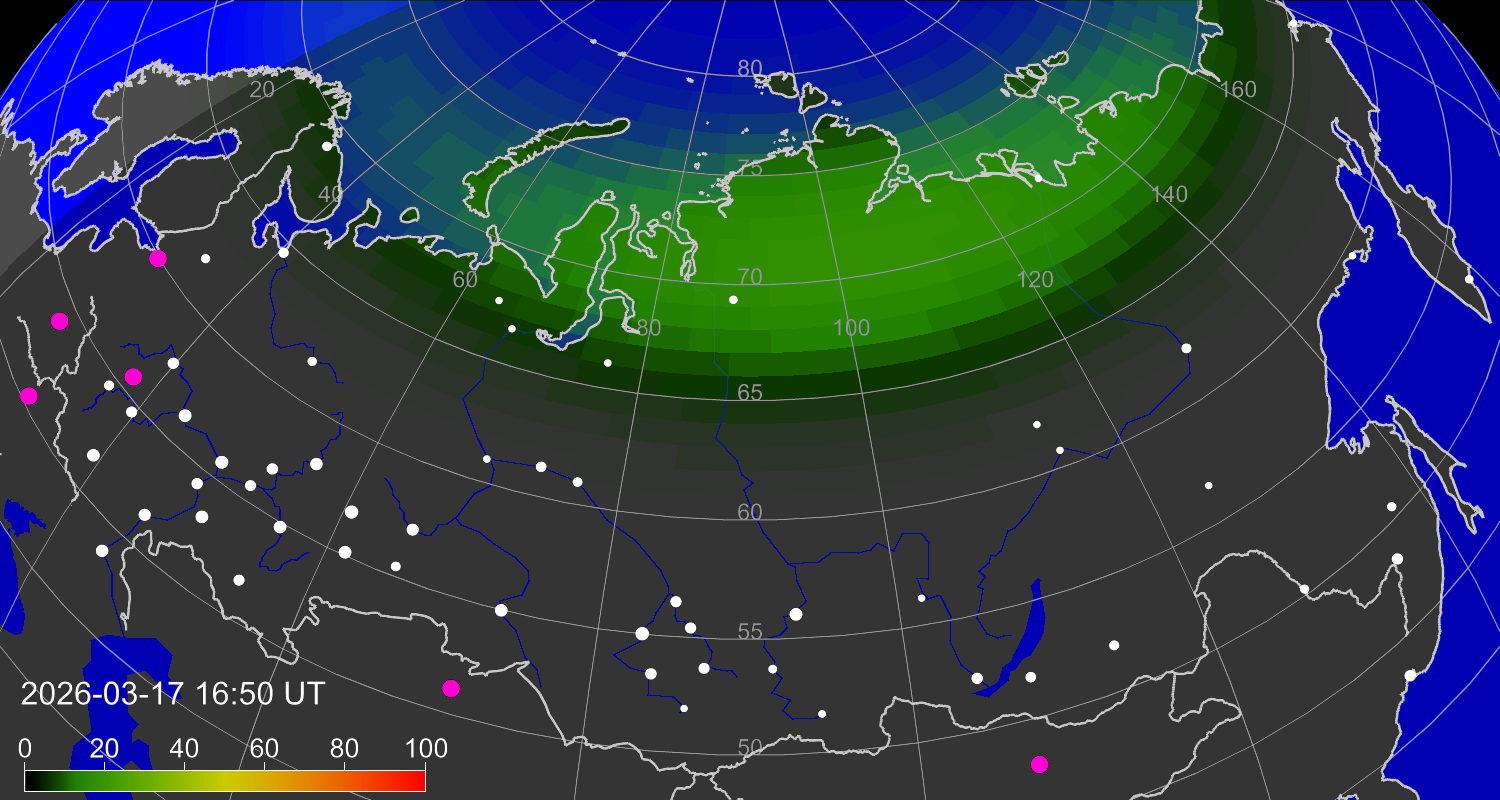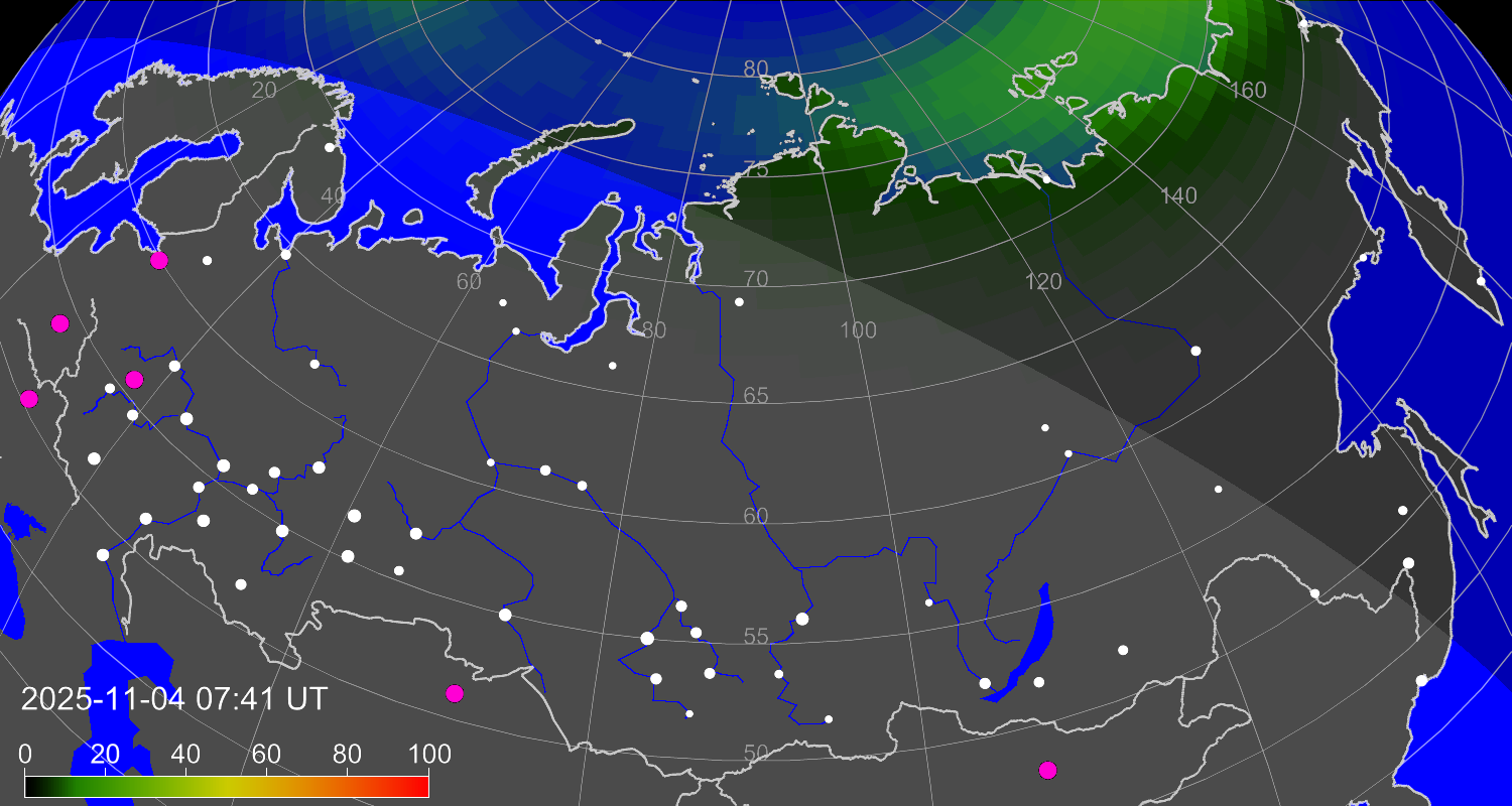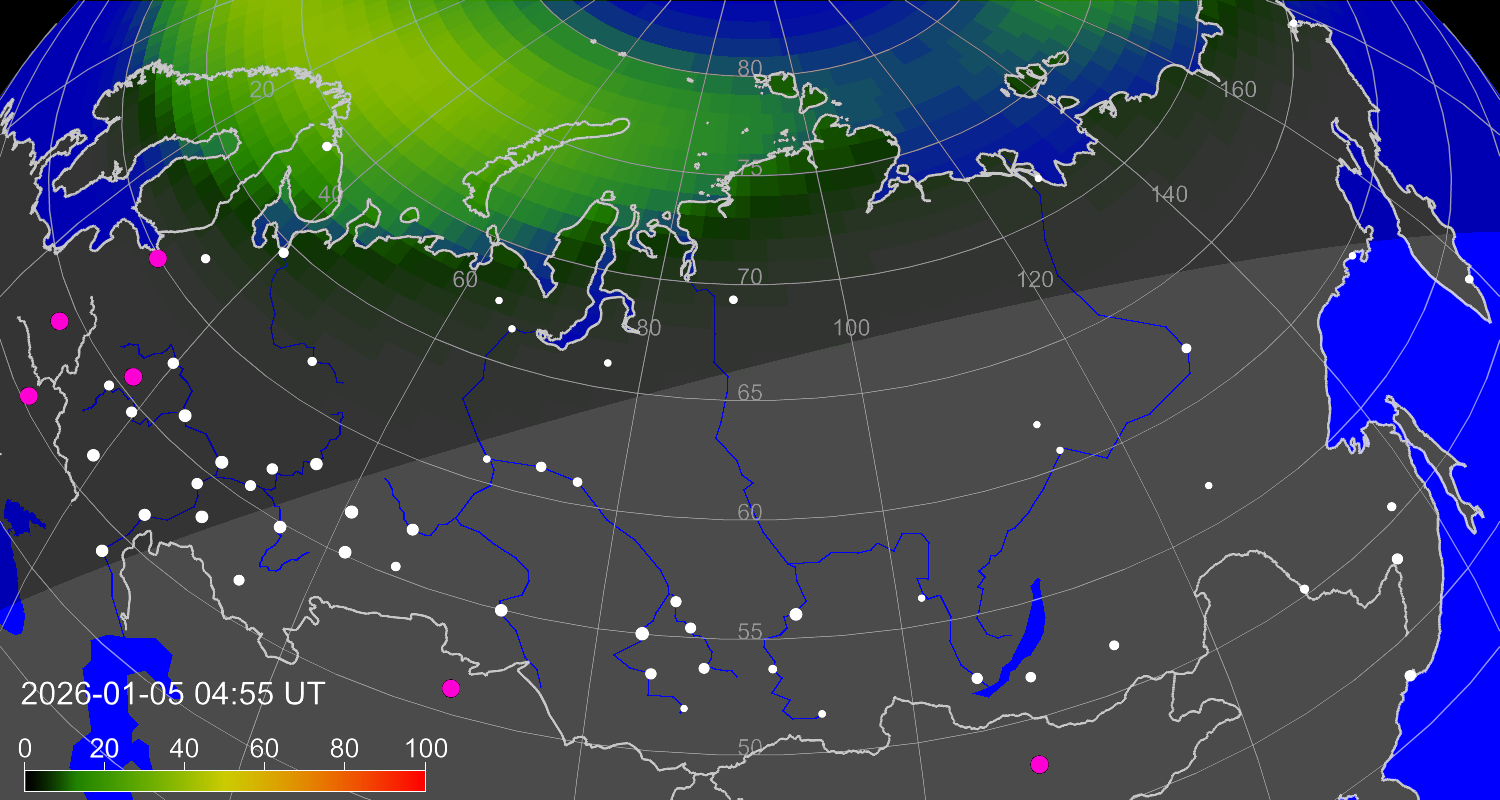 Индекс интенсивности полярных сияний и теоретически возможная широта наблюдений для ночного времени в восточном полушарии