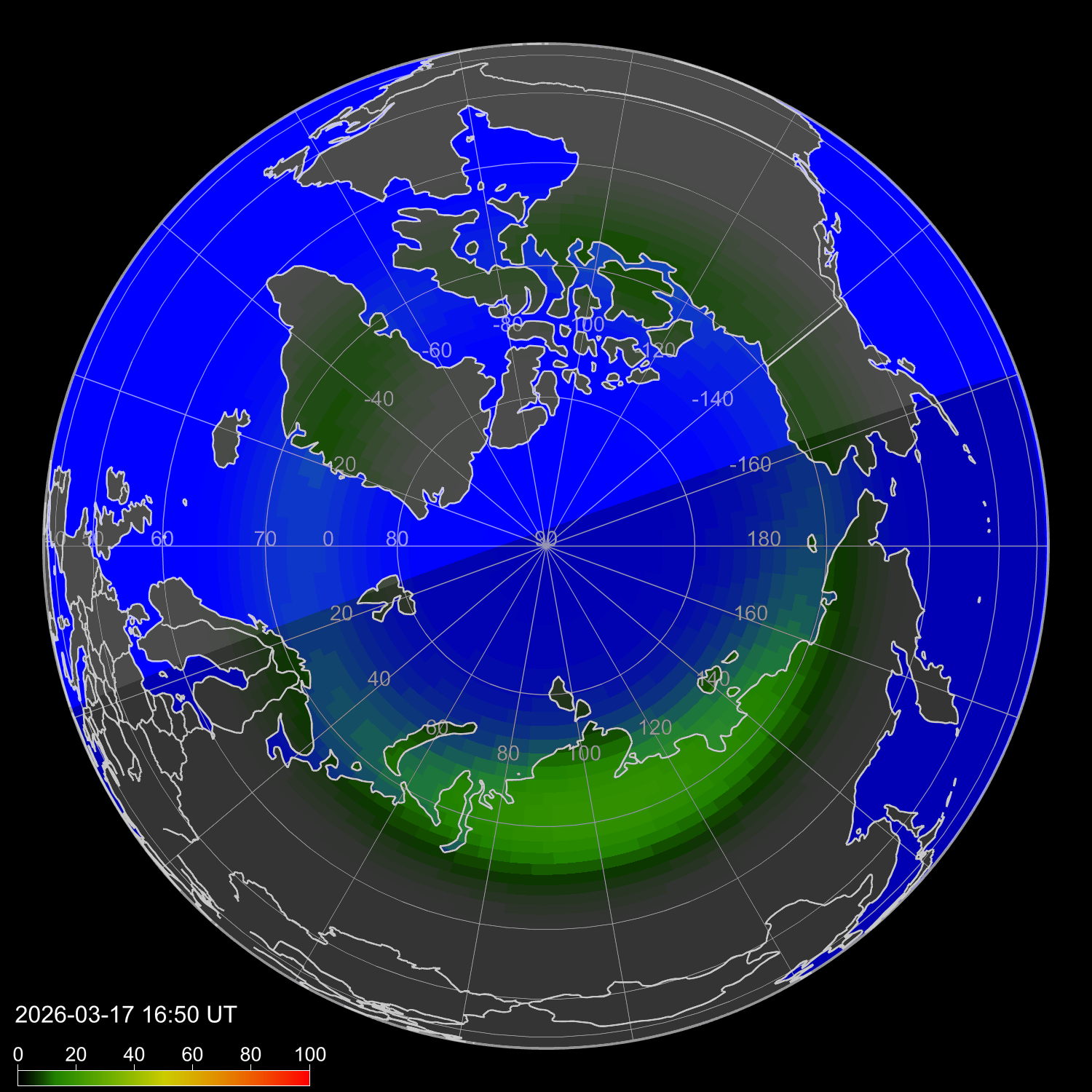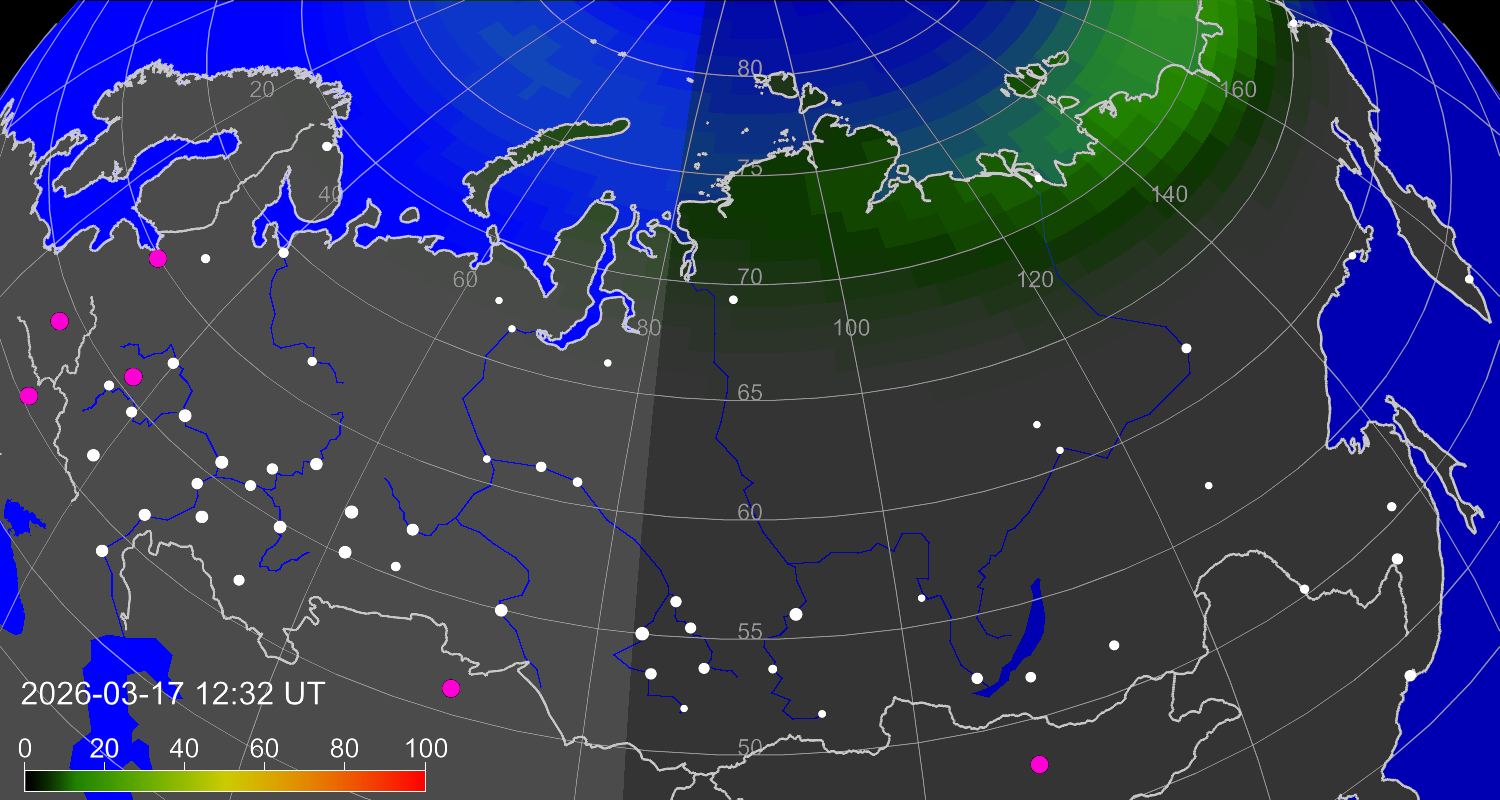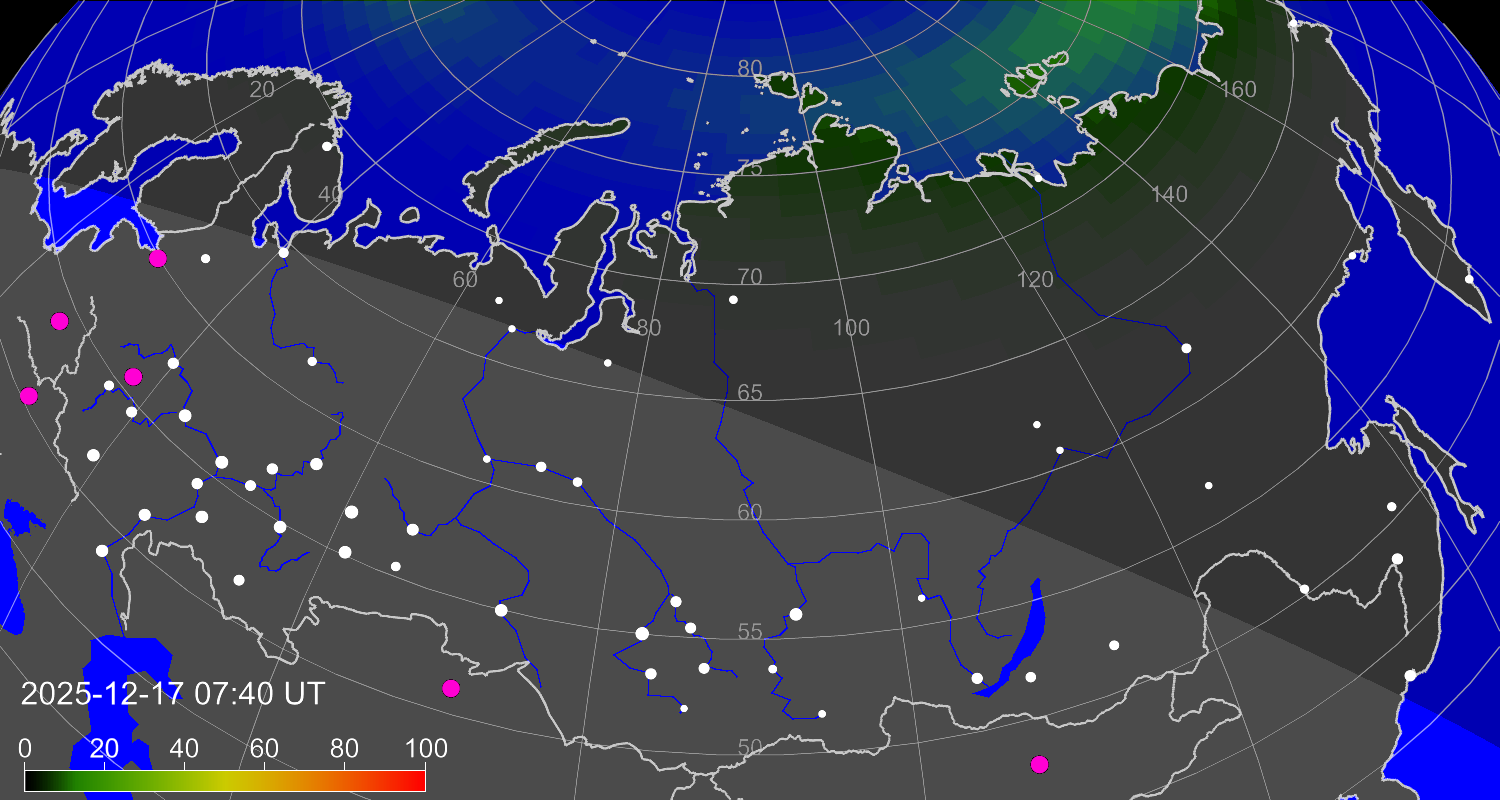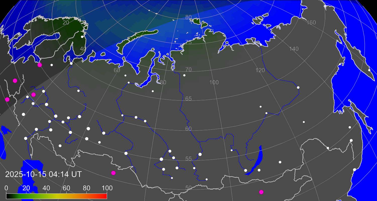 Индекс интенсивности полярных сияний и теоретически возможная широта наблюдений для ночного времени в восточном полушарии
