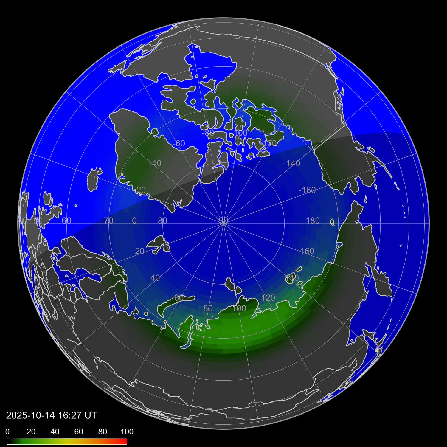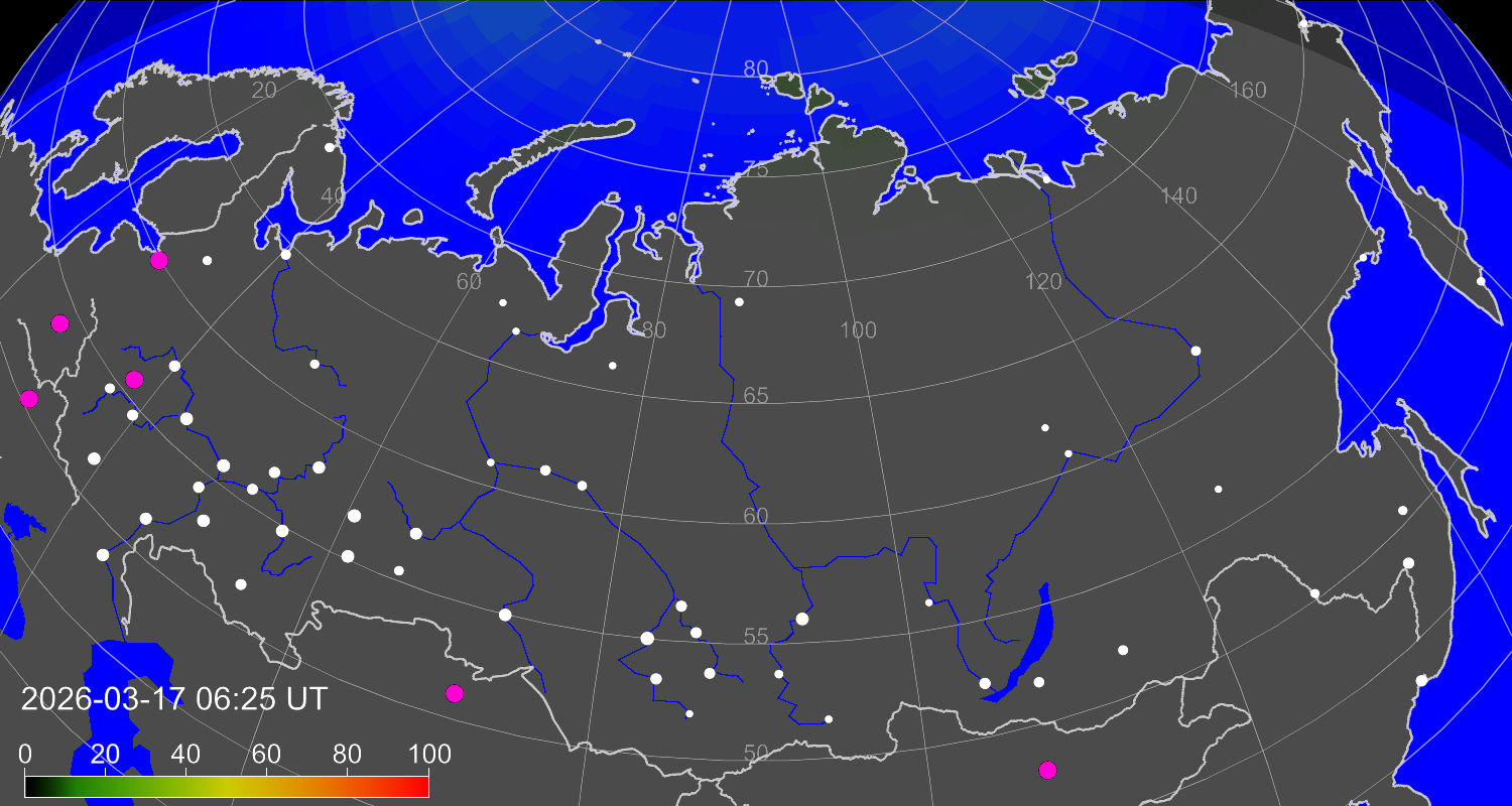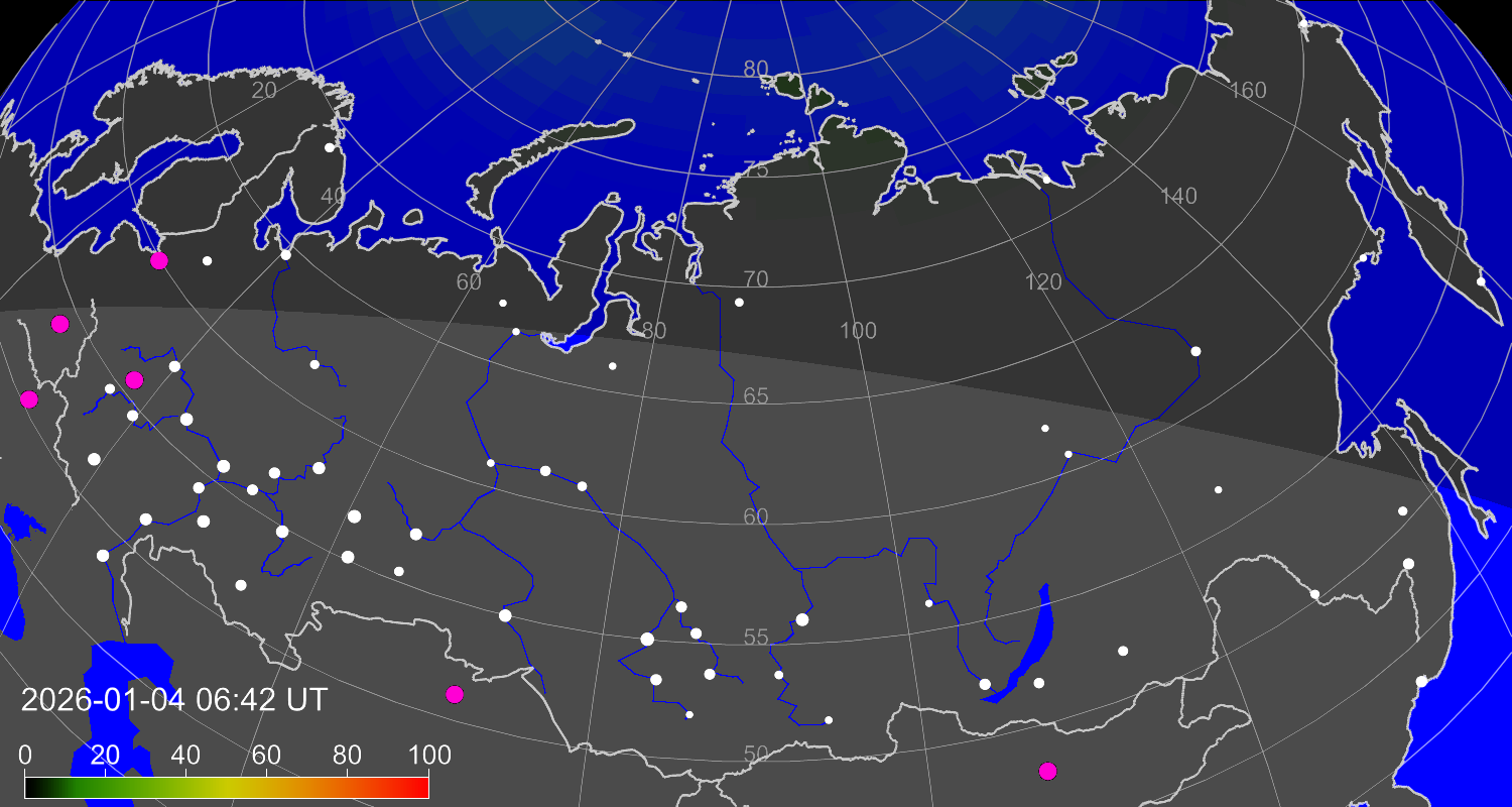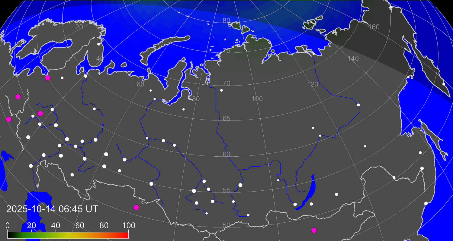 Индекс интенсивности полярных сияний и теоретически возможная широта наблюдений для ночного времени в восточном полушарии