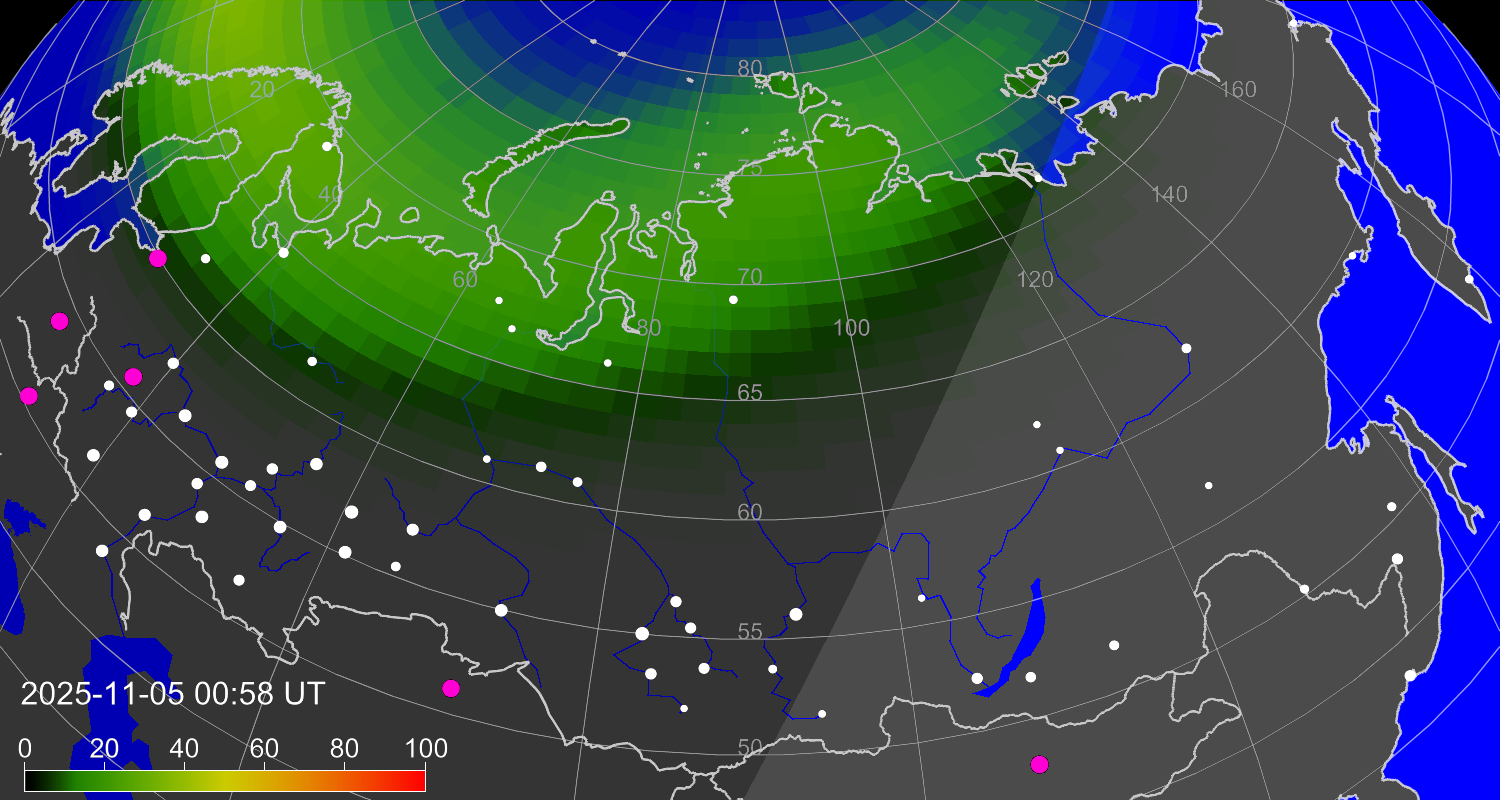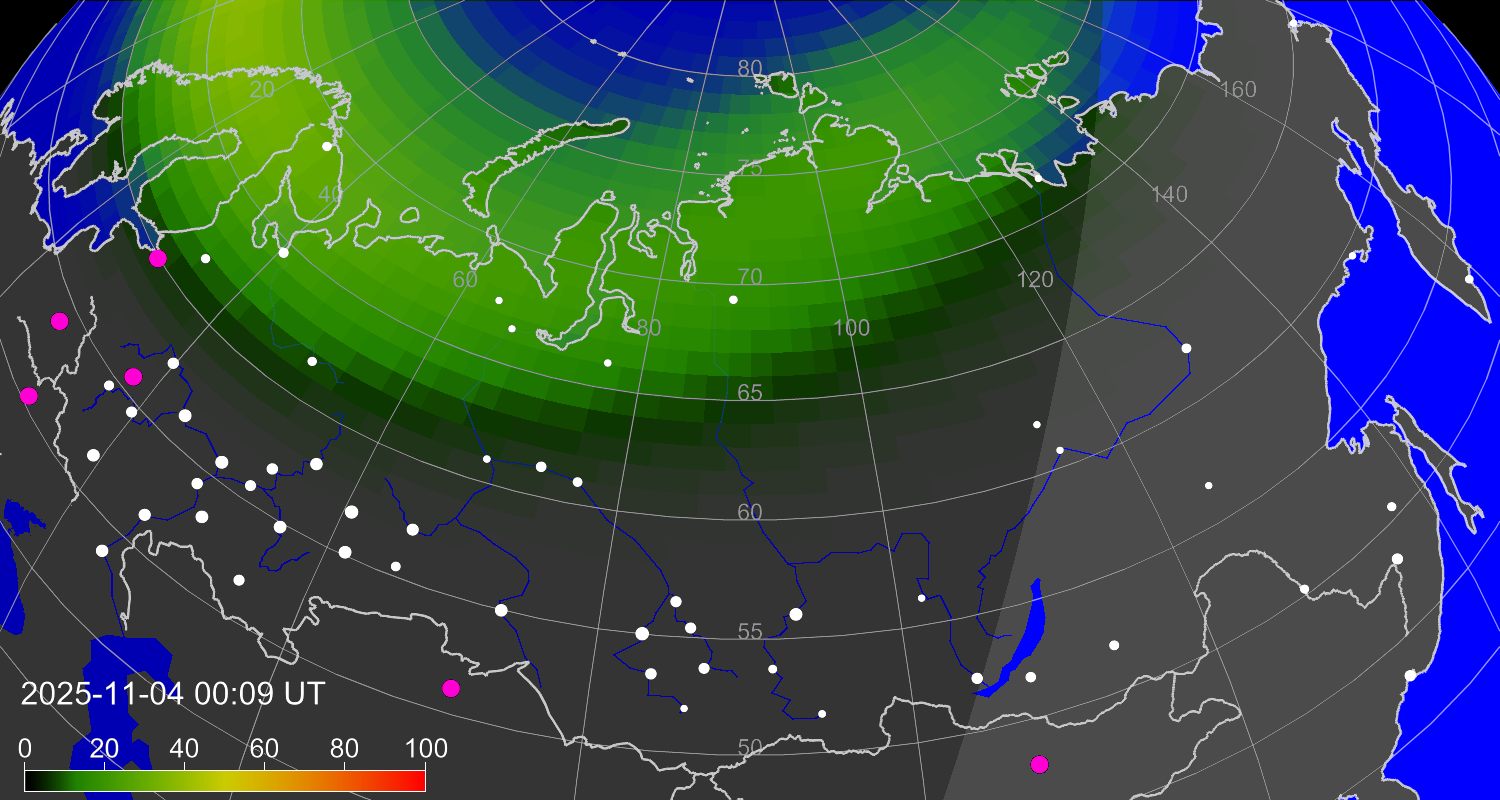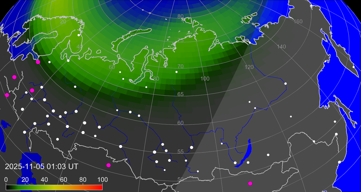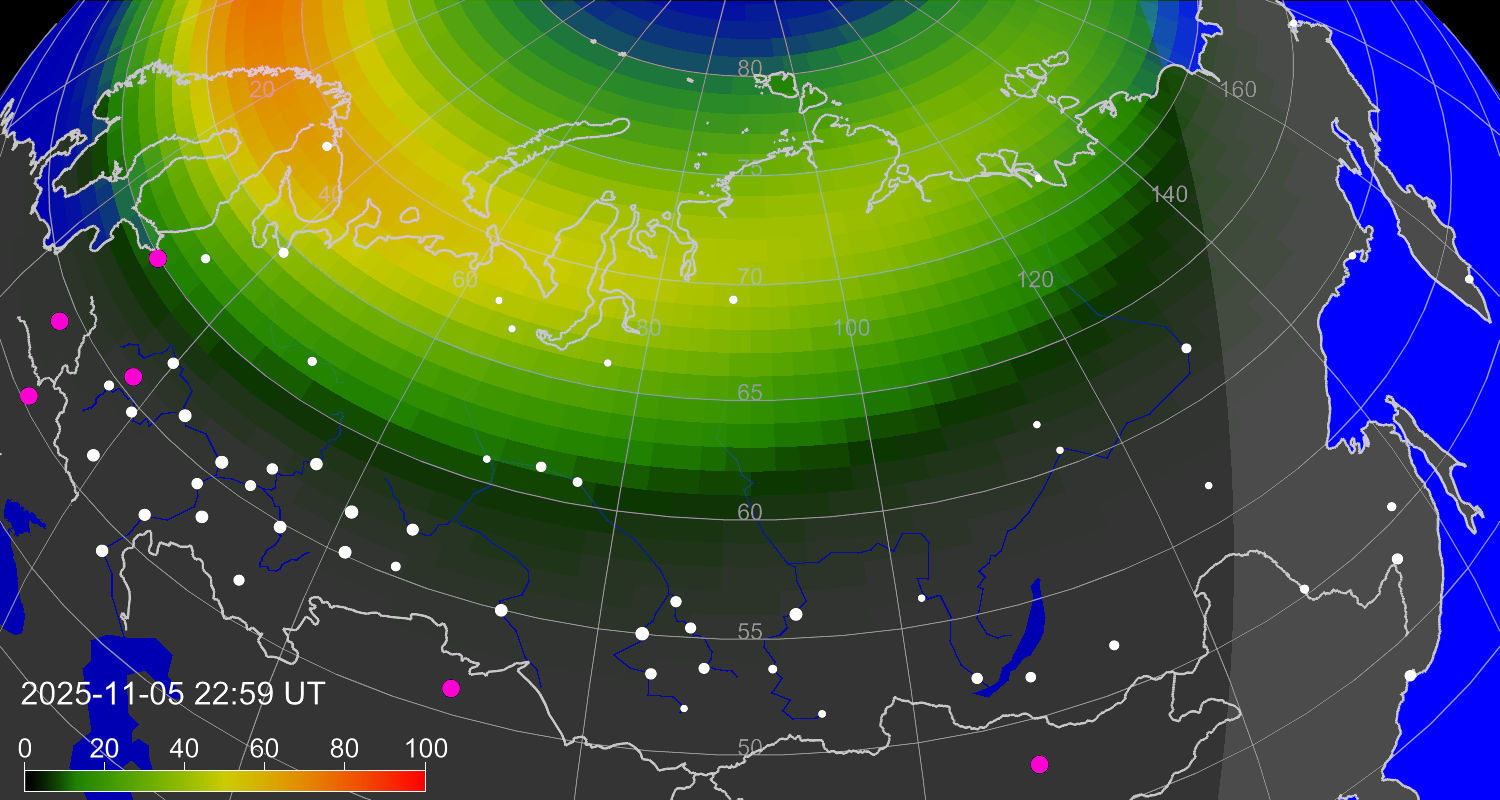 Изменения и часовой прогноз индекса интенсивности полярных сияний с 2025-11-04 по 2025-11-05