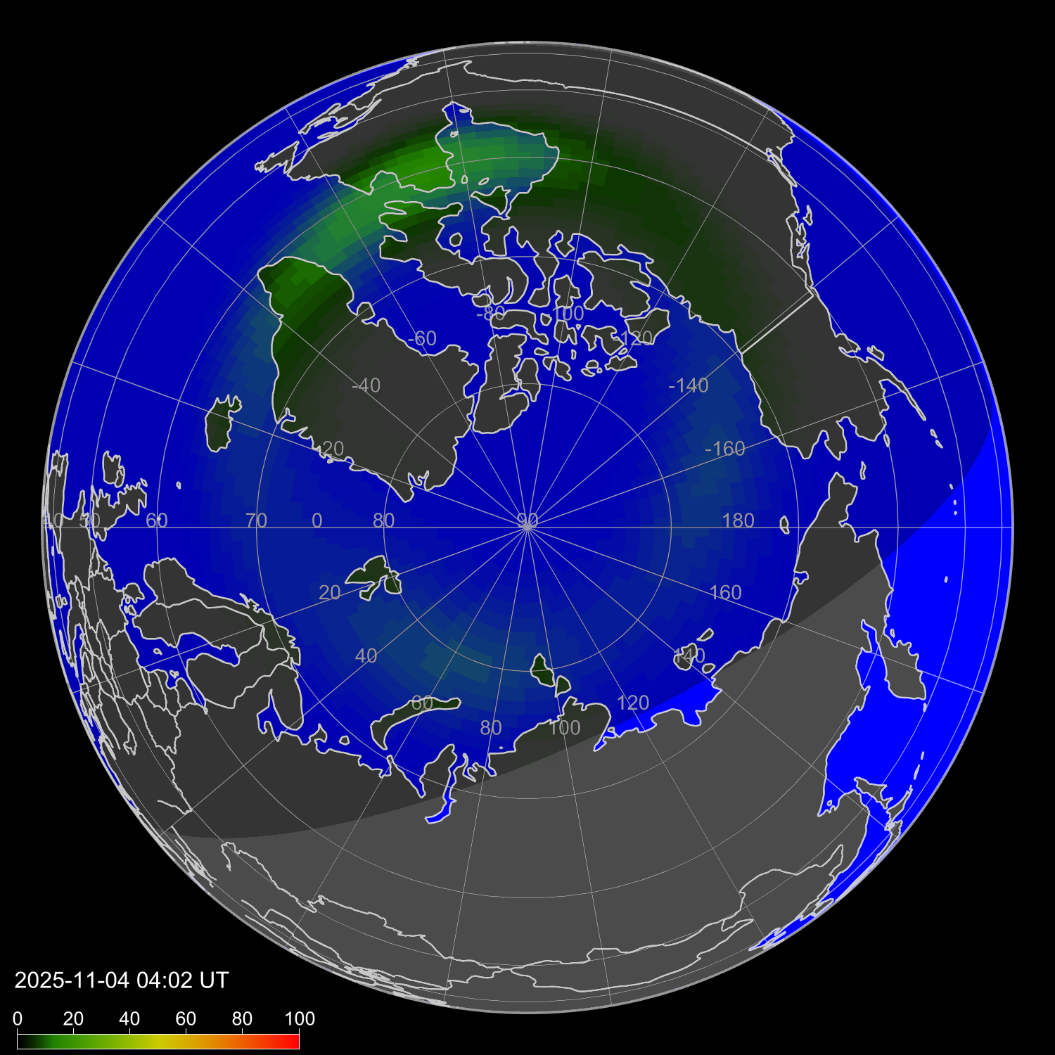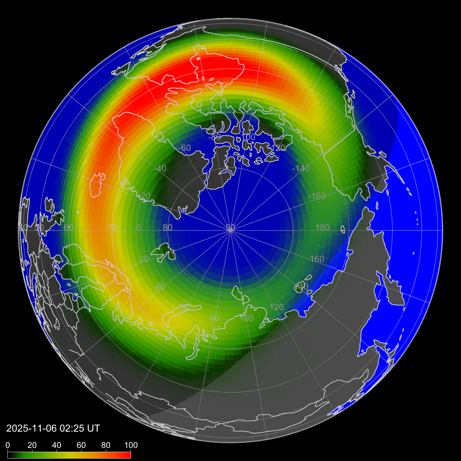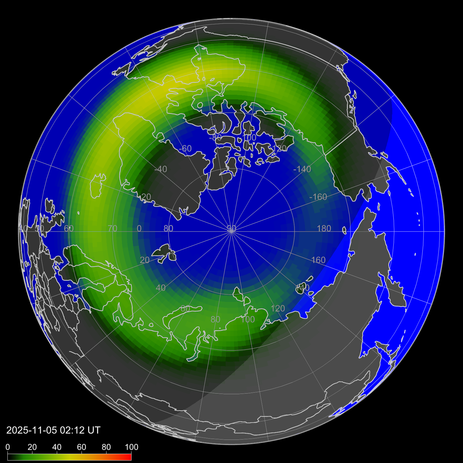 Изменения и часовой прогноз индекса интенсивности полярных сияний с 2025-11-04 по 2025-11-05