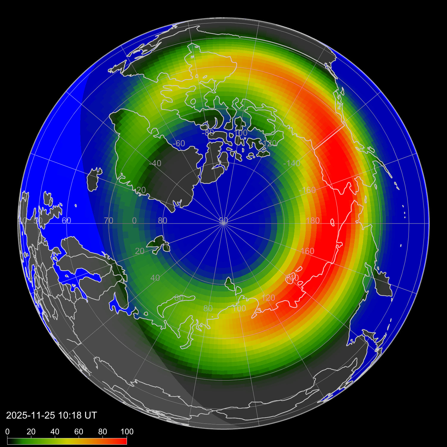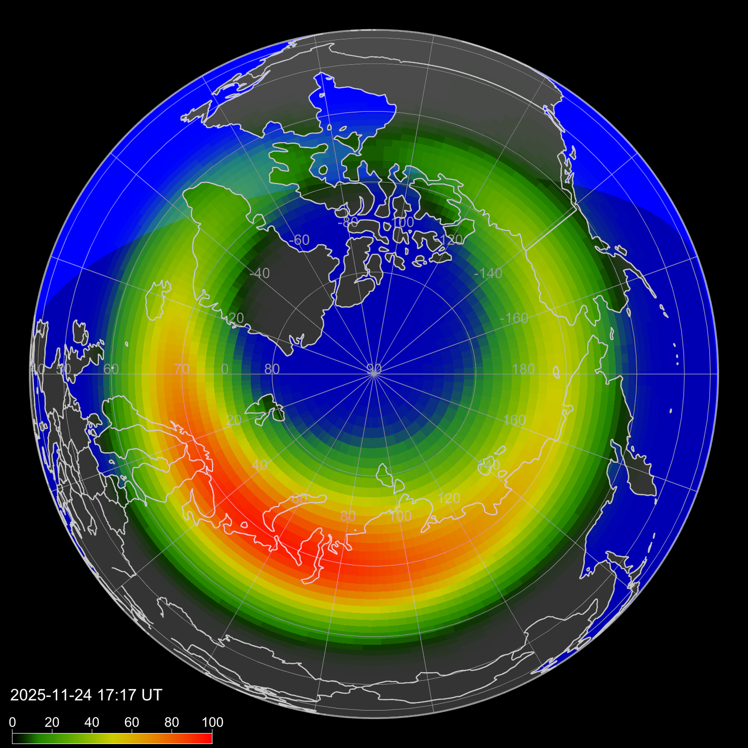 Изменения и часовой прогноз индекса интенсивности полярных сияний с 2025-11-24 по 2025-11-25