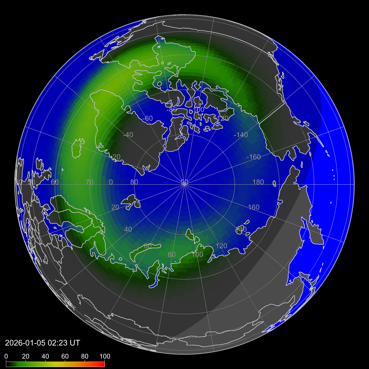 Изменения и часовой прогноз индекса интенсивности полярных сияний с 2026-01-04 по 2026-01-05