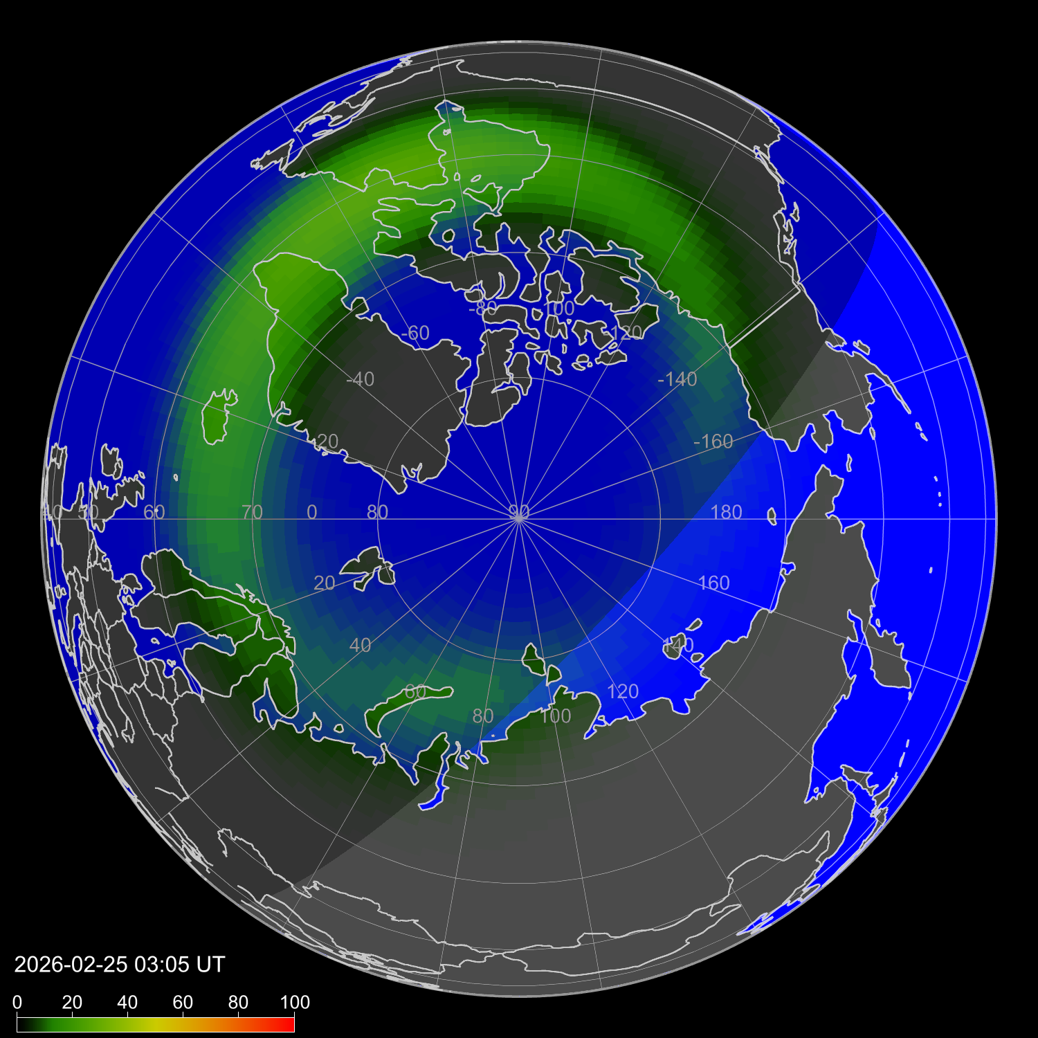Изменения и часовой прогноз индекса интенсивности полярных сияний с 2026-02-24 по 2026-02-25
