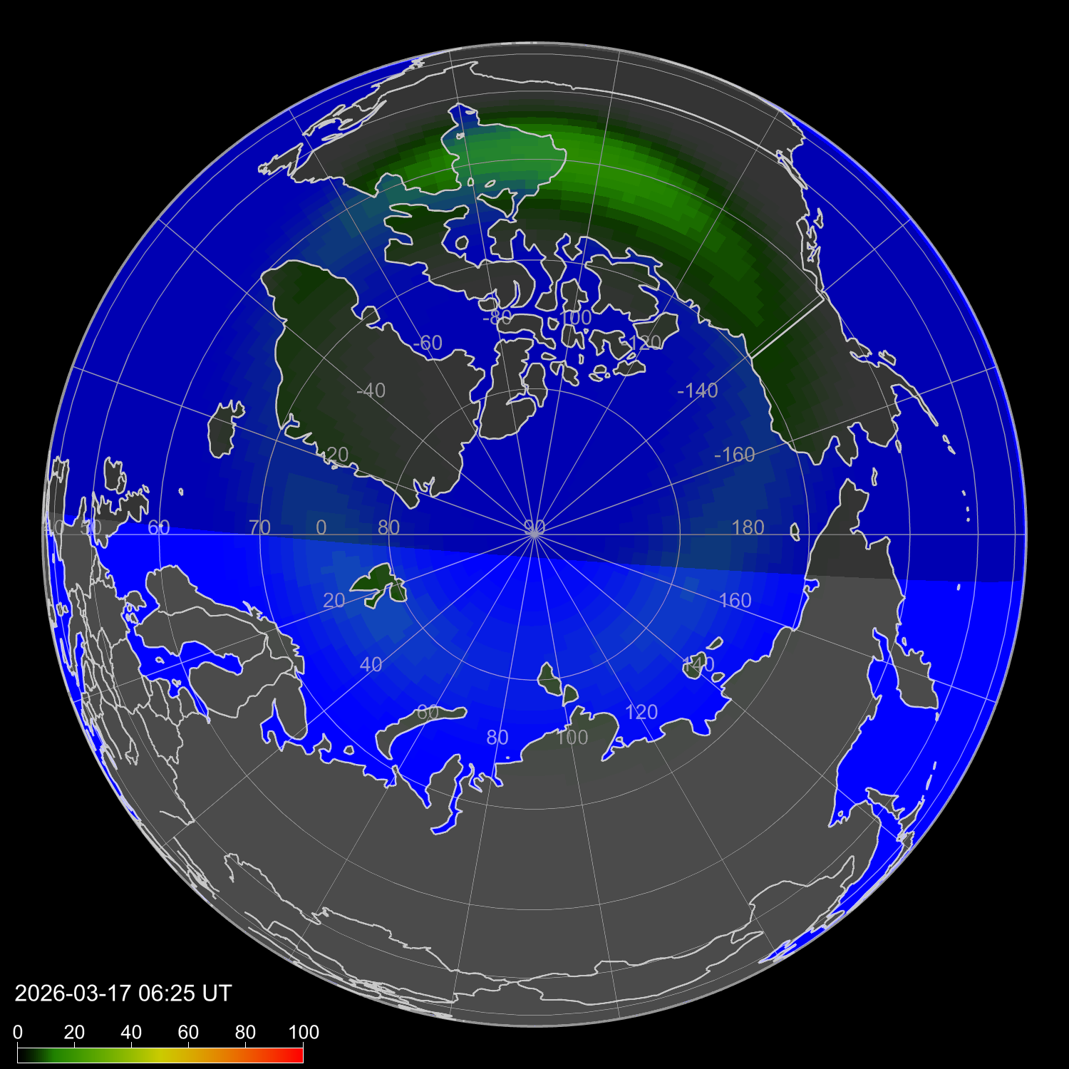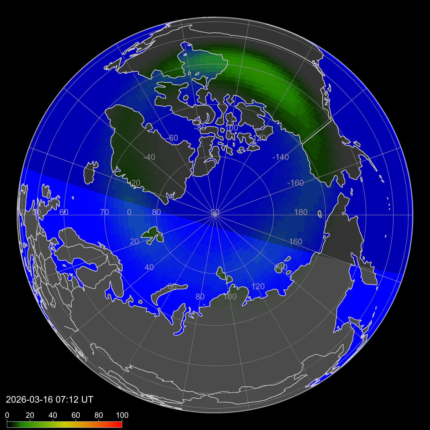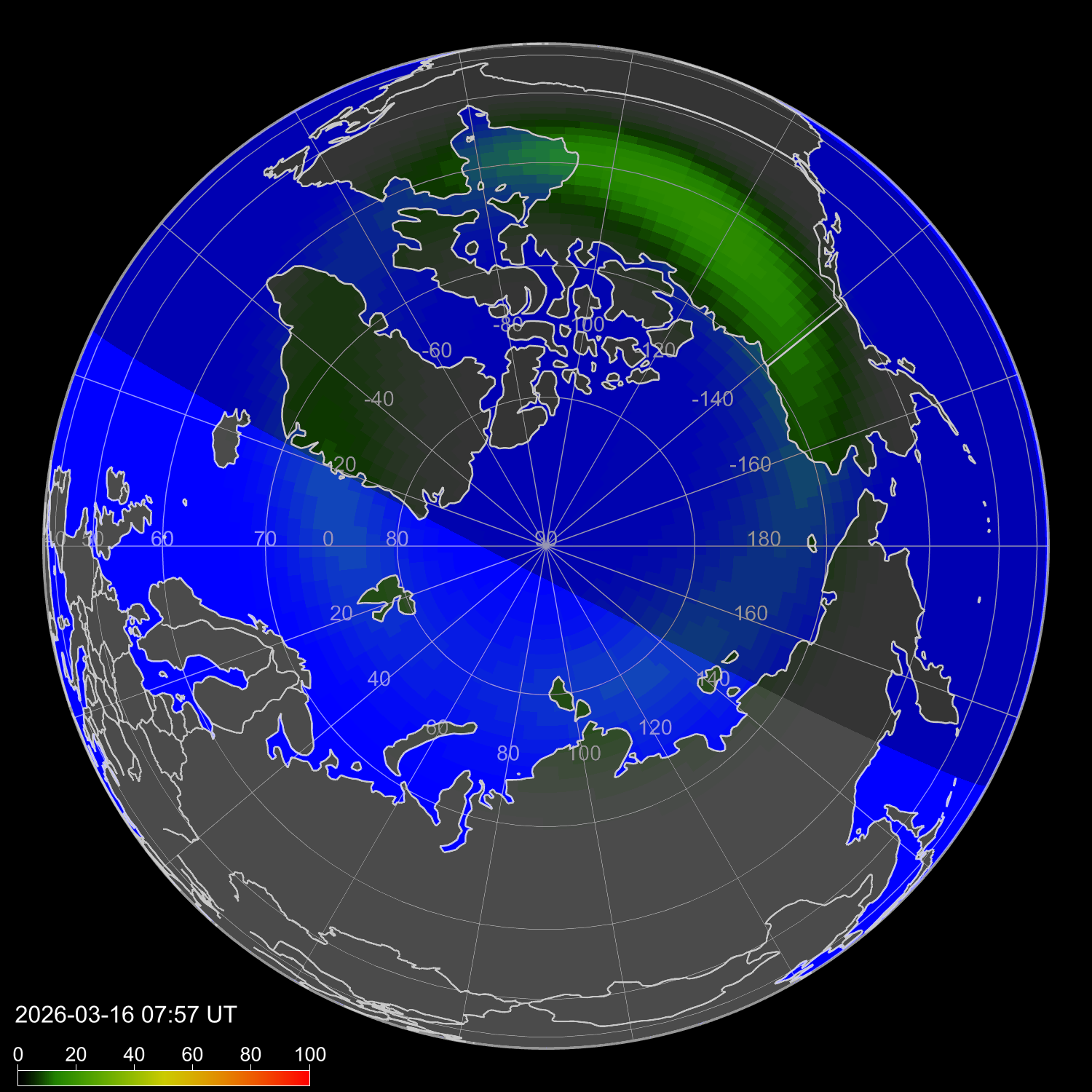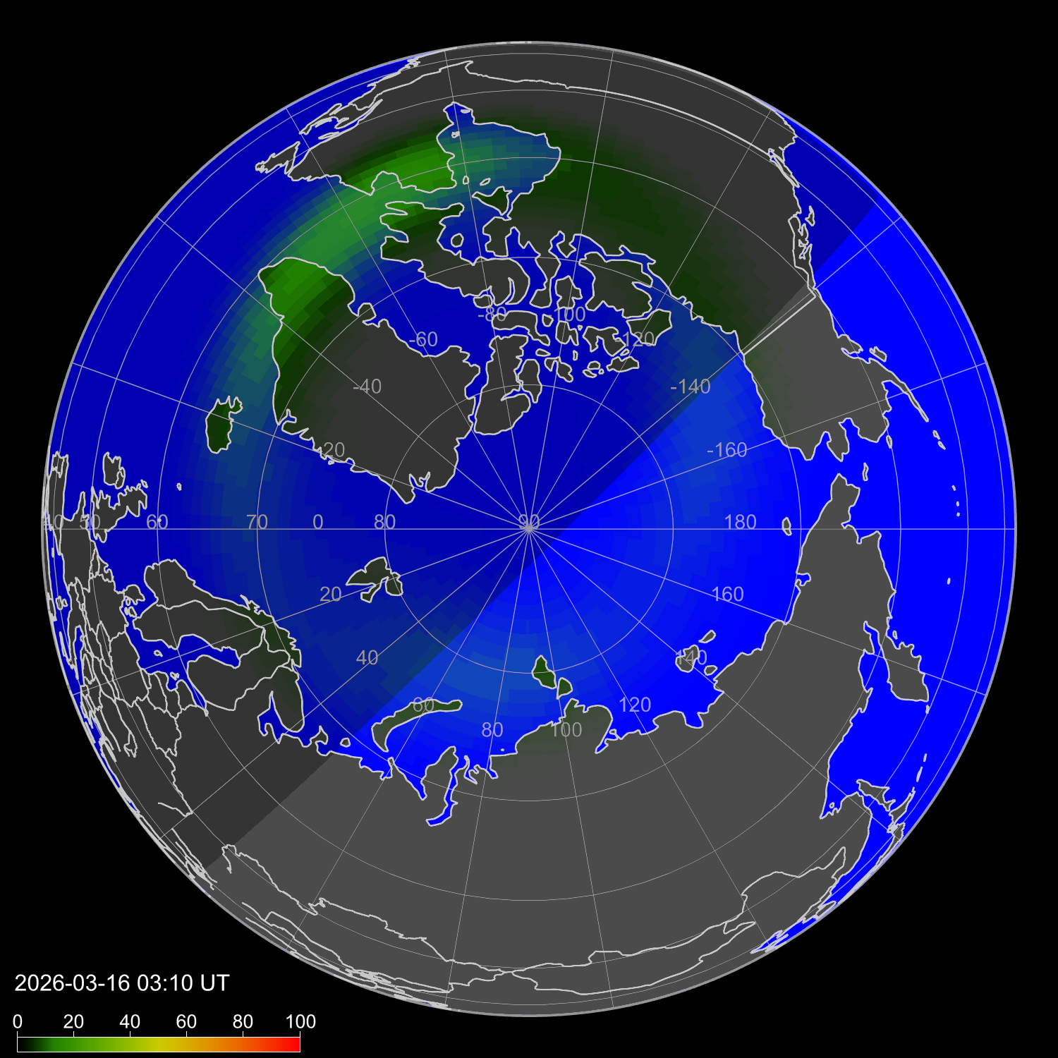Изменения и часовой прогноз индекса интенсивности полярных сияний с 2026-03-15 по 2026-03-16