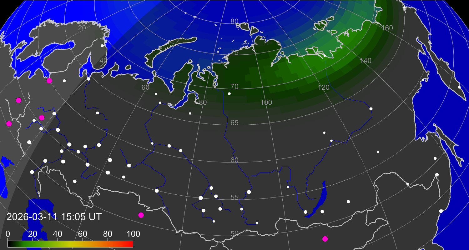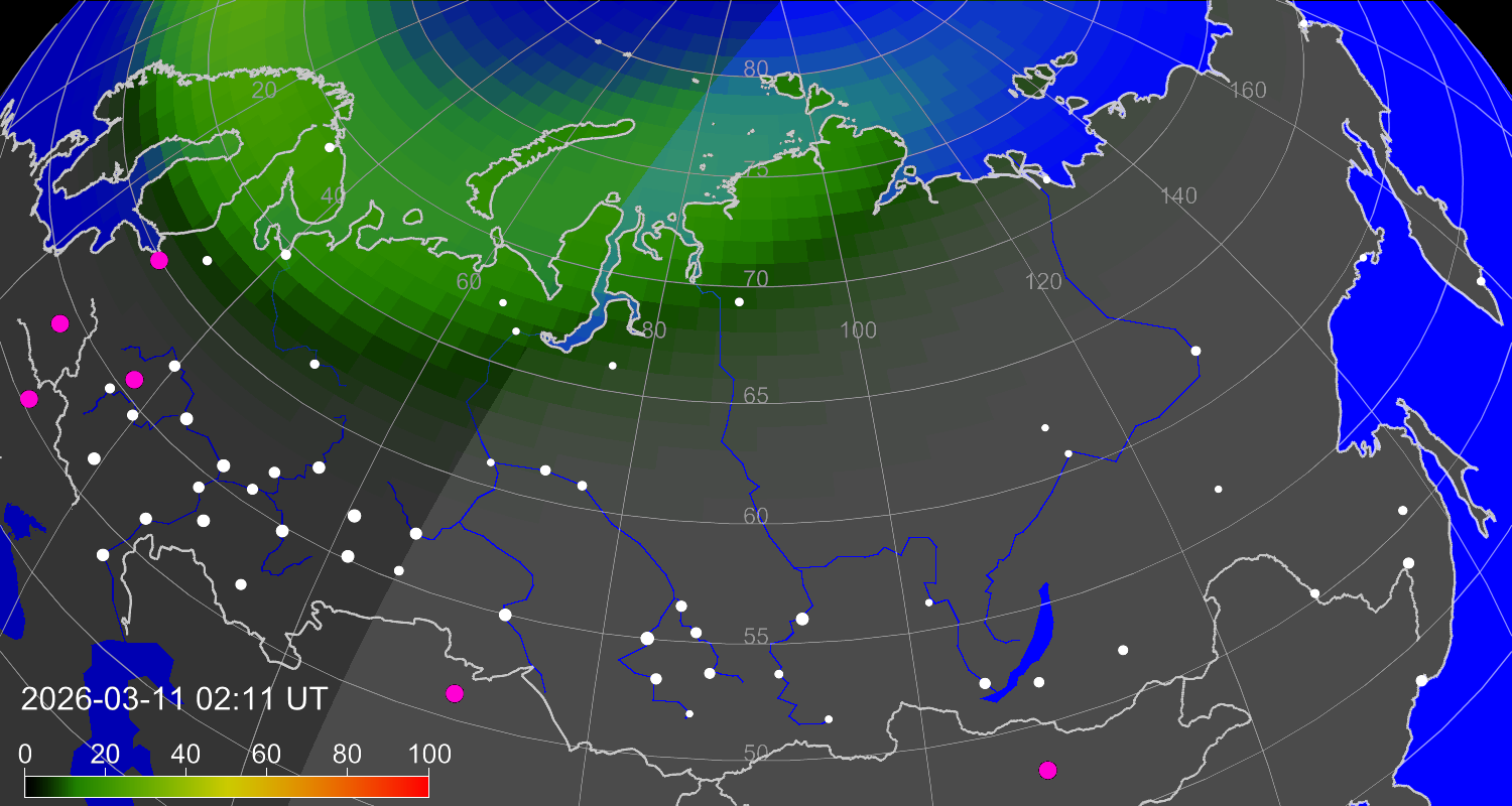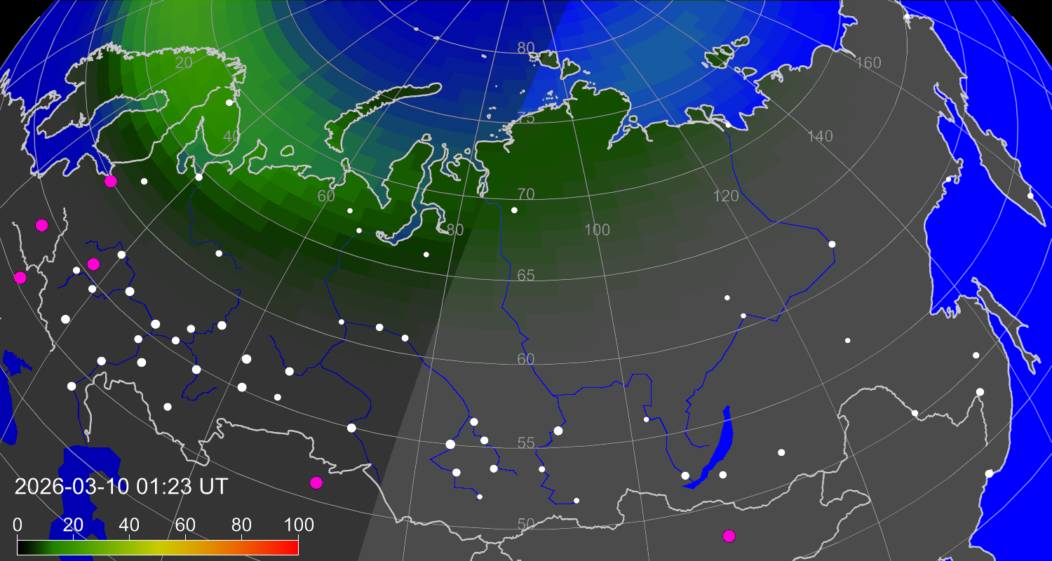 Вероятность полярных сияний в городах Российской Федерации