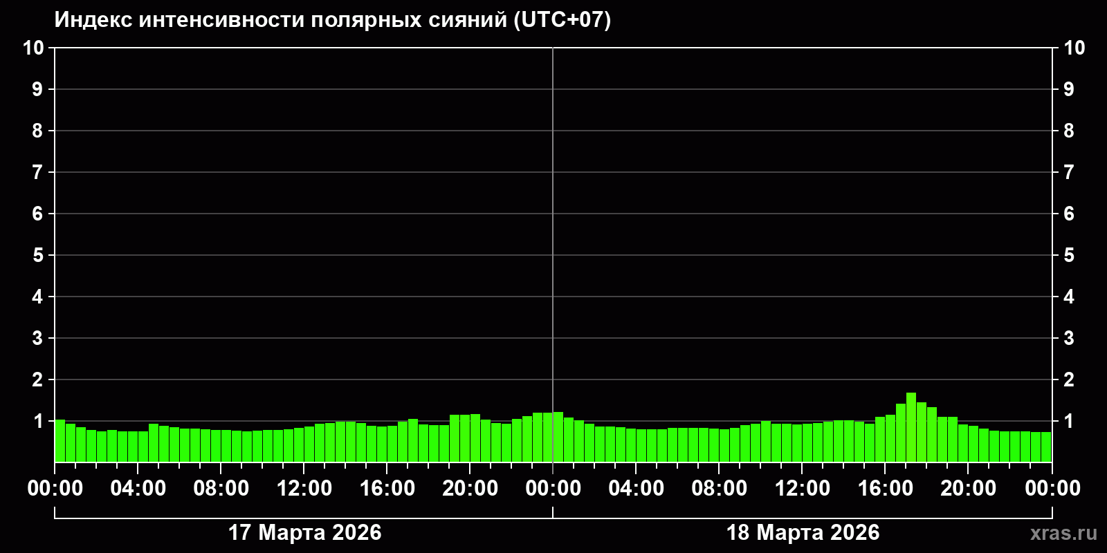 Изменения индекса интенсивности полярных сияний с 2026-03-17 по 2026-03-18 по местному времени