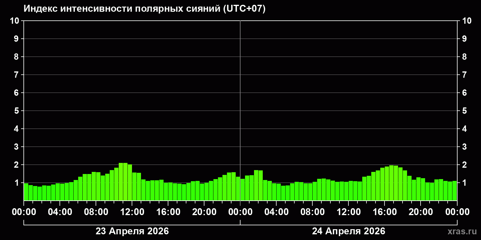 Изменения индекса интенсивности полярных сияний с 2026-04-23 по 2026-04-24 по местному времени