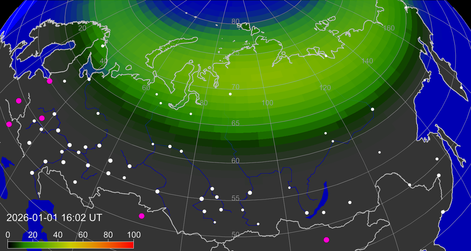 Индекс интенсивности полярных сияний и теоретически возможная широта наблюдений для ночного времени в восточном полушарии