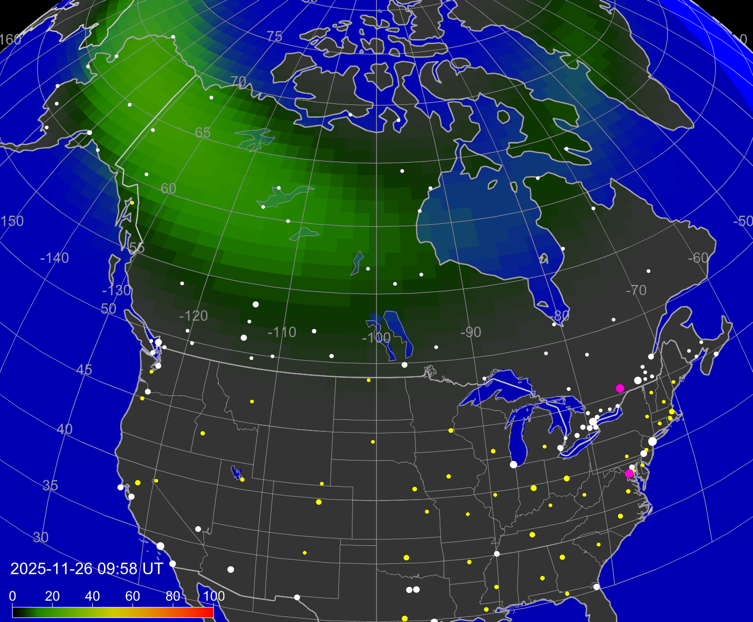 Изменения и часовой прогноз индекса интенсивности полярных сияний с 2025-11-25 по 2025-11-26