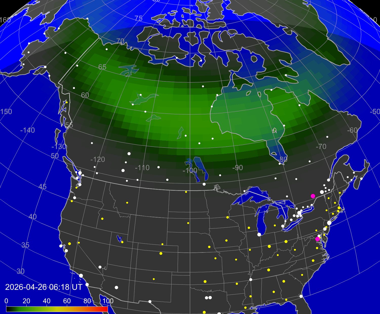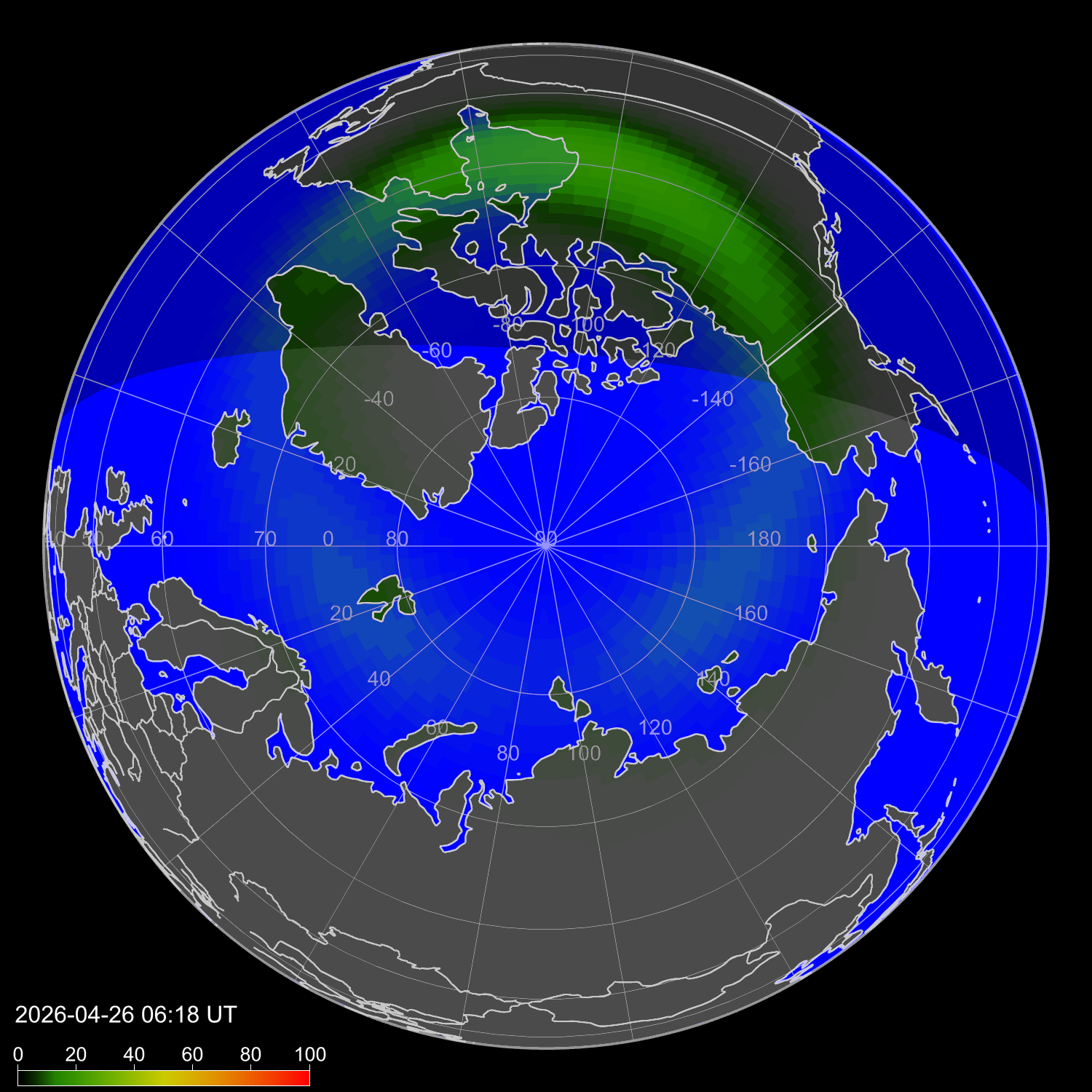 Индекс интенсивности полярных сияний и теоретически возможная широта наблюдений для ночного времени в западном полушарии