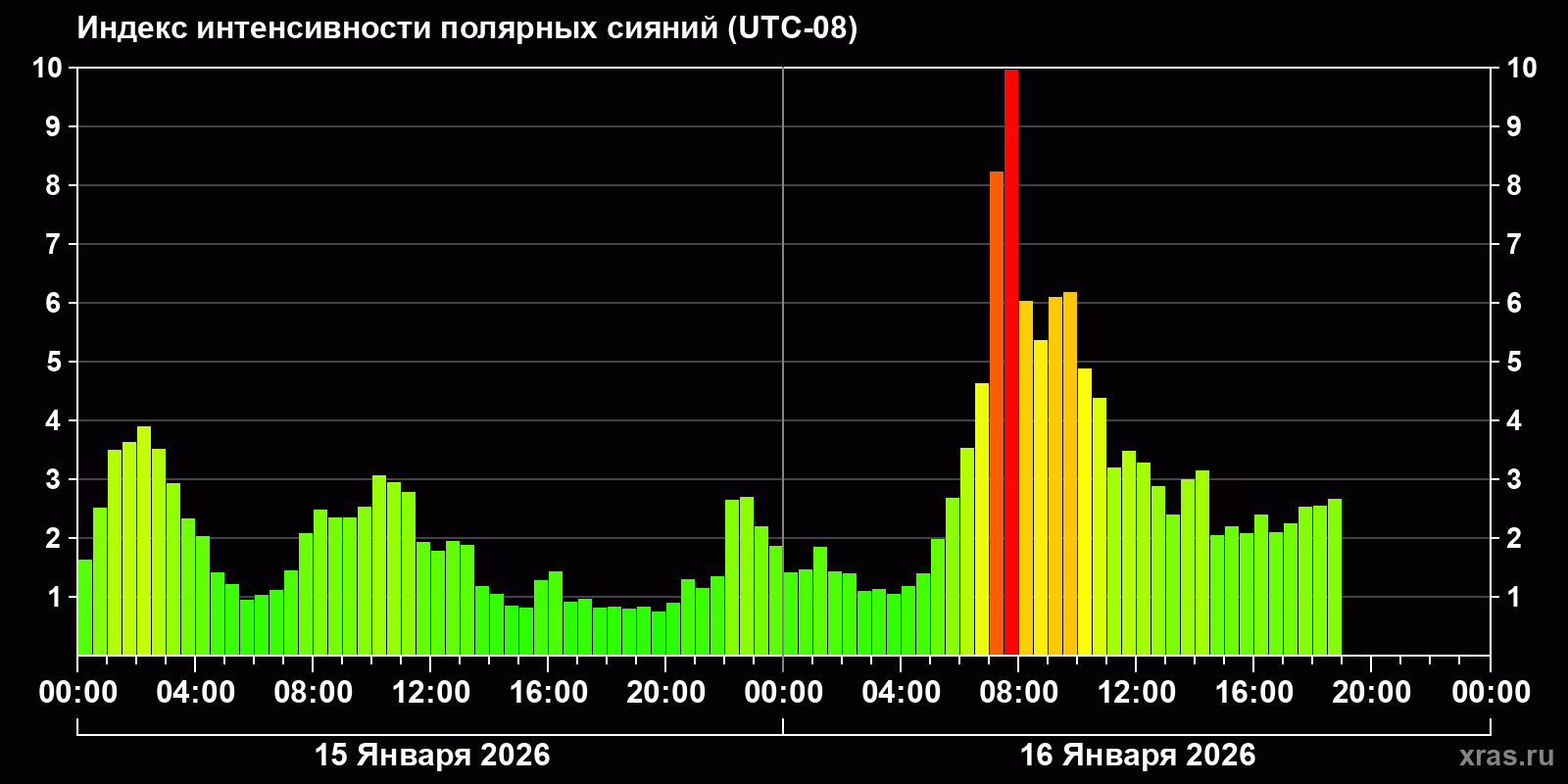 Изменения индекса интенсивности полярных сияний с 2026-01-15 по 2026-01-16 по местному времени
