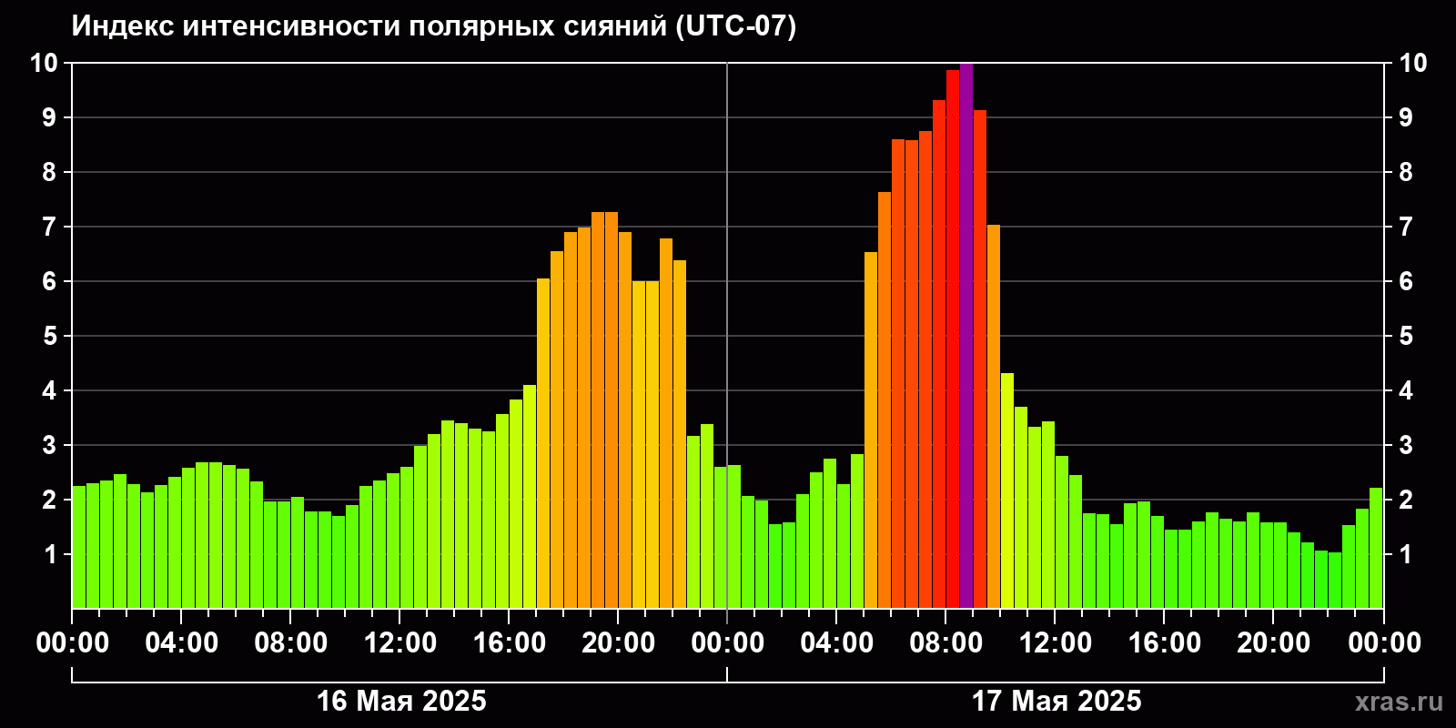 Изменения индекса интенсивности полярных сияний с 2025-05-16 по 2025-05-17 по местному времени
