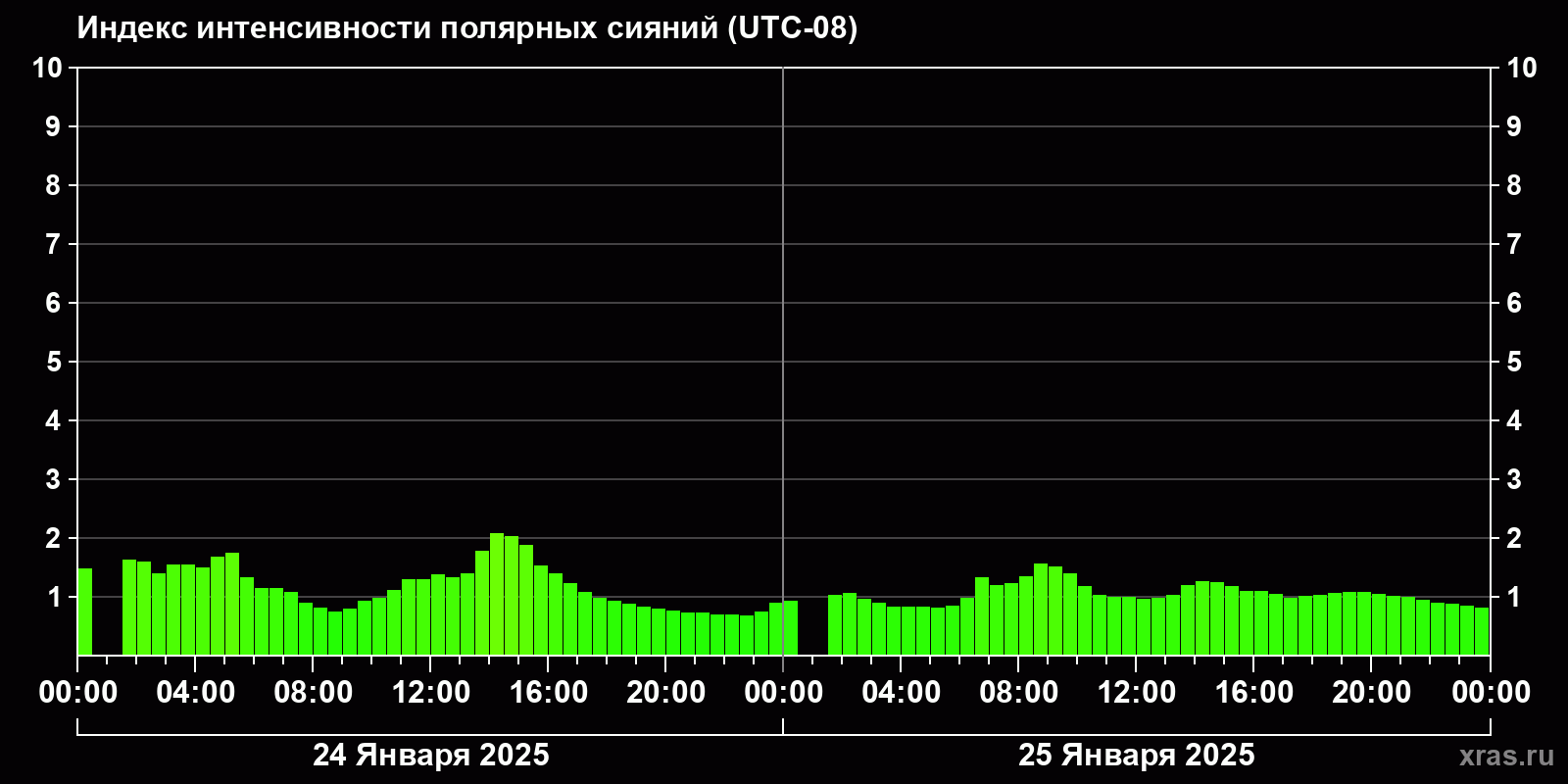 Изменения индекса интенсивности полярных сияний с 2025-01-24 по 2025-01-25 по местному времени