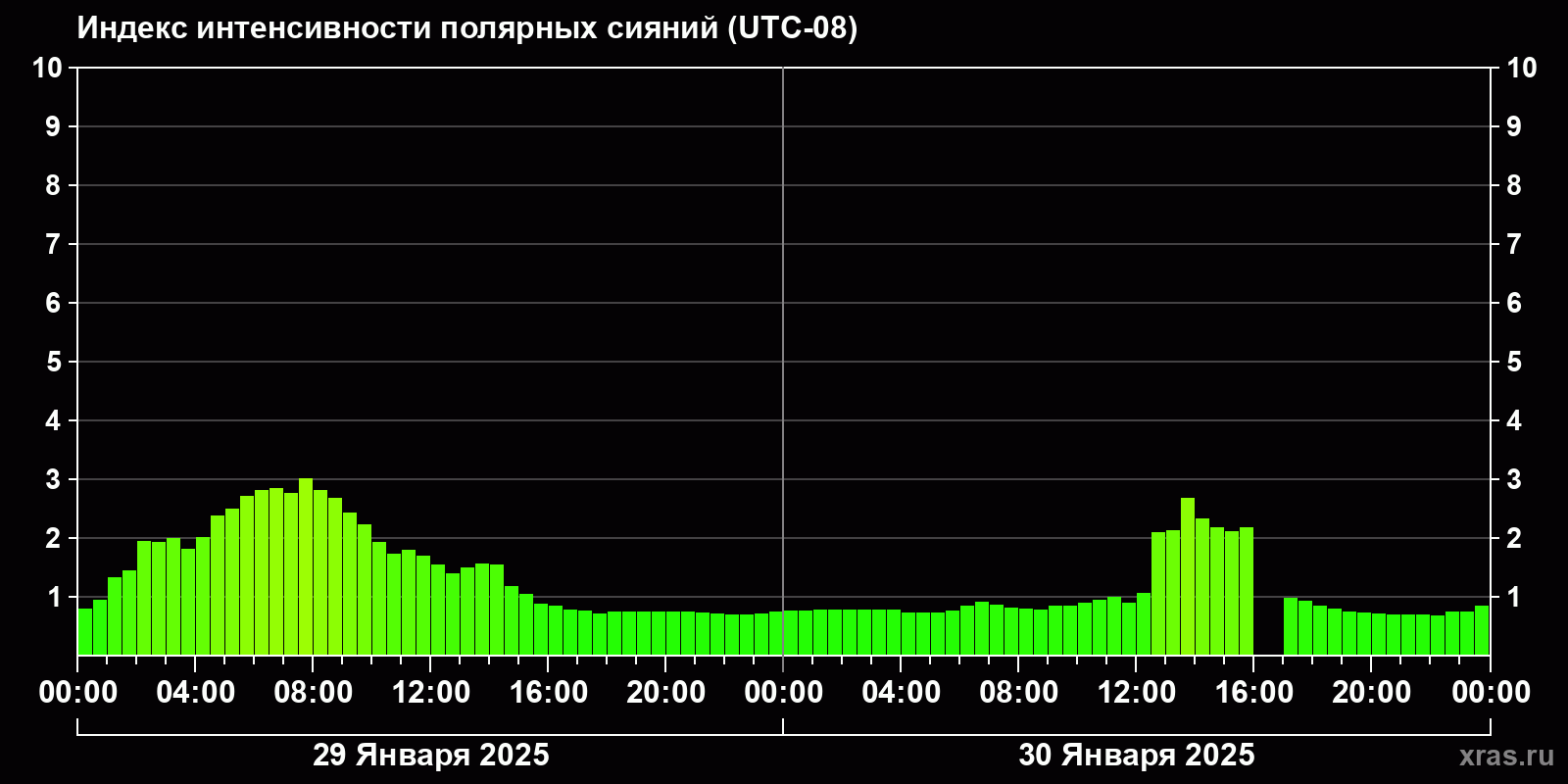 Изменения индекса интенсивности полярных сияний с 2025-01-29 по 2025-01-30 по местному времени