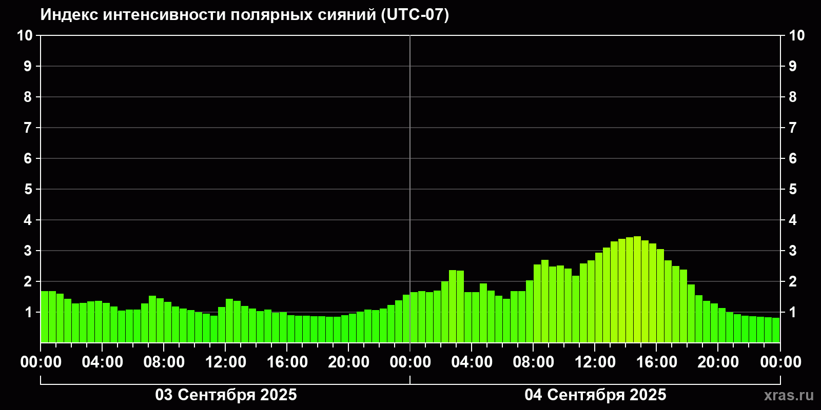 Изменения индекса интенсивности полярных сияний с 2025-09-03 по 2025-09-04 по местному времени