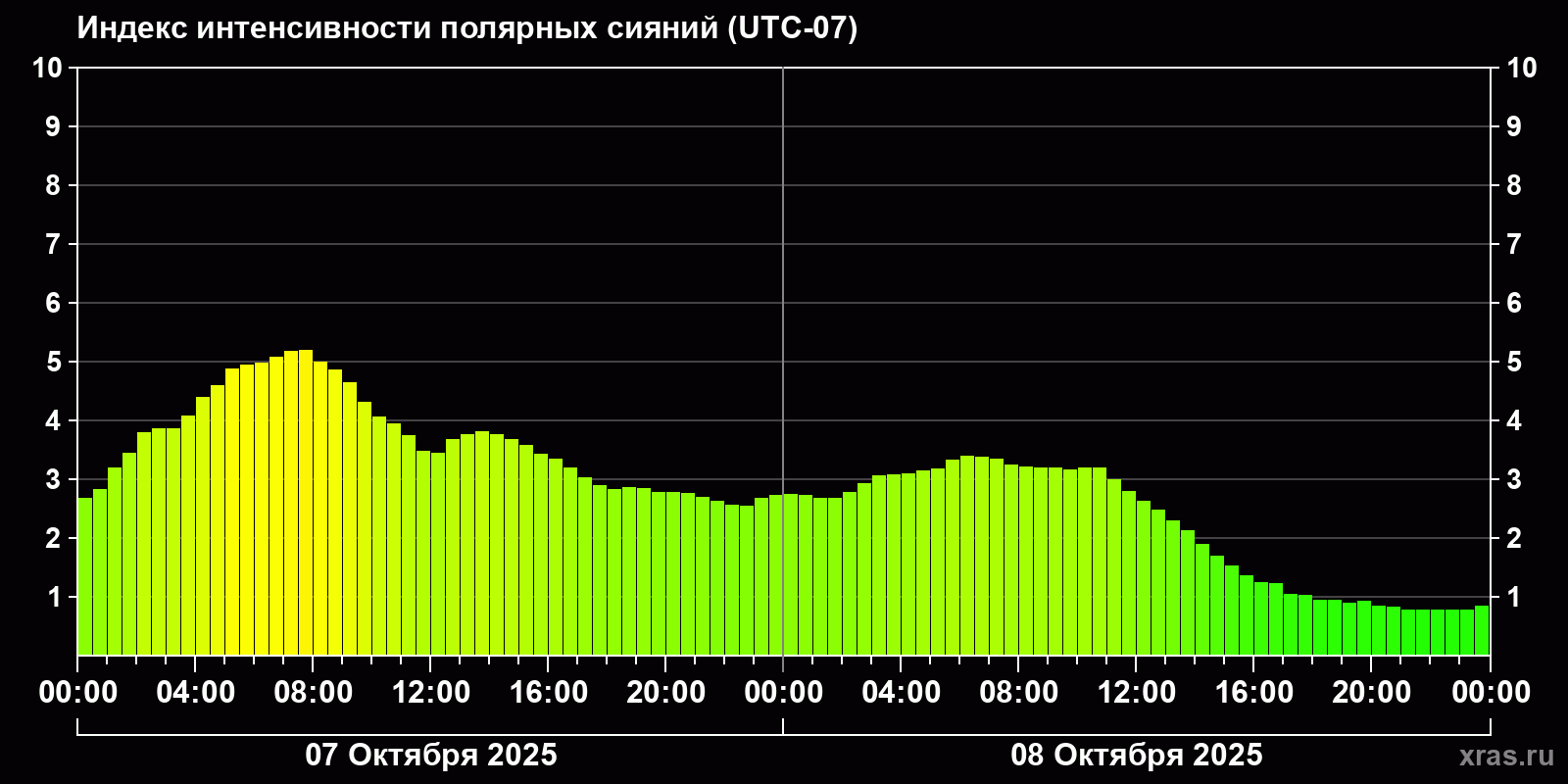 Изменения индекса интенсивности полярных сияний с 2025-10-07 по 2025-10-08 по местному времени