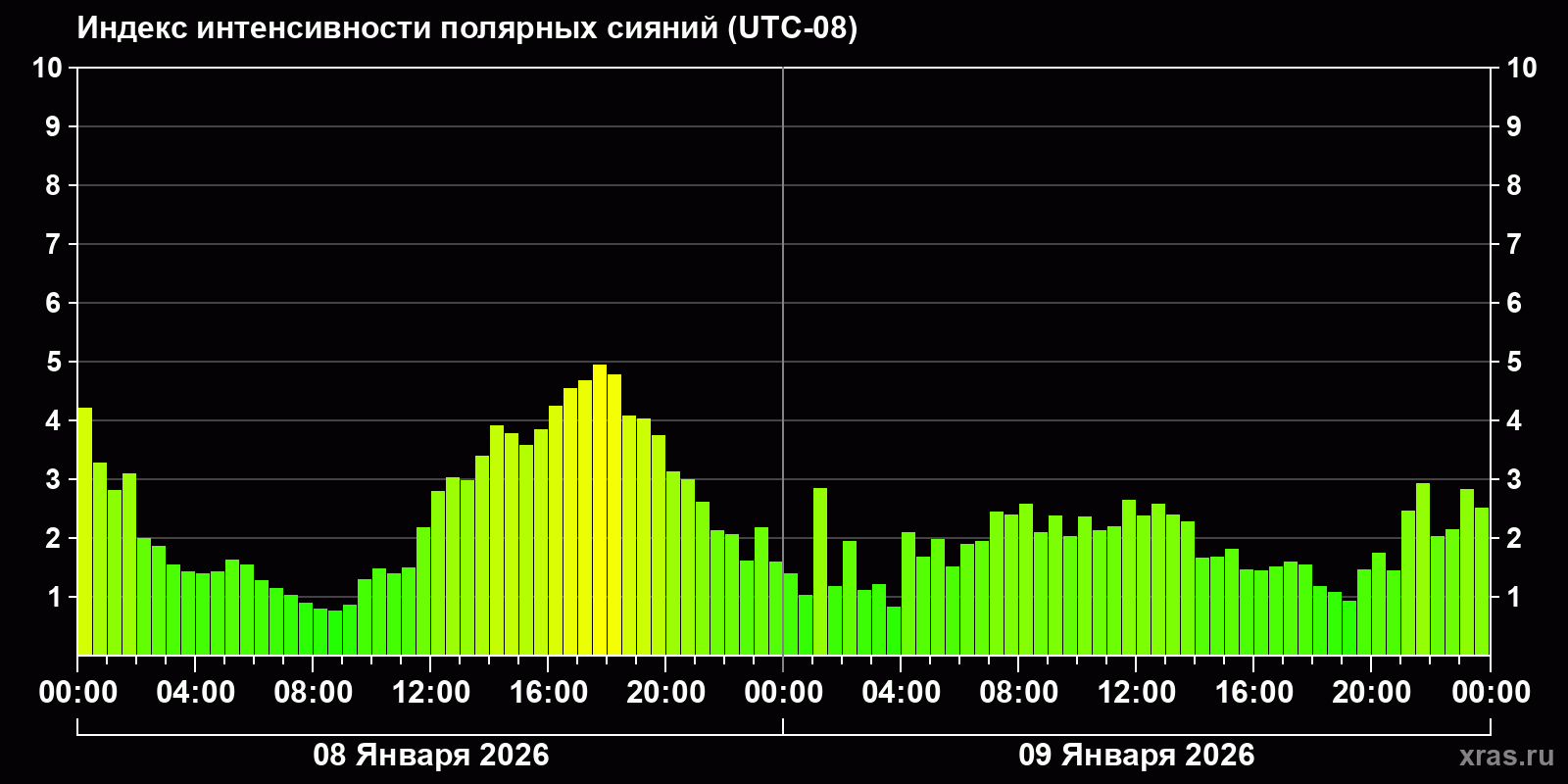 Изменения индекса интенсивности полярных сияний с 2026-01-08 по 2026-01-09 по местному времени