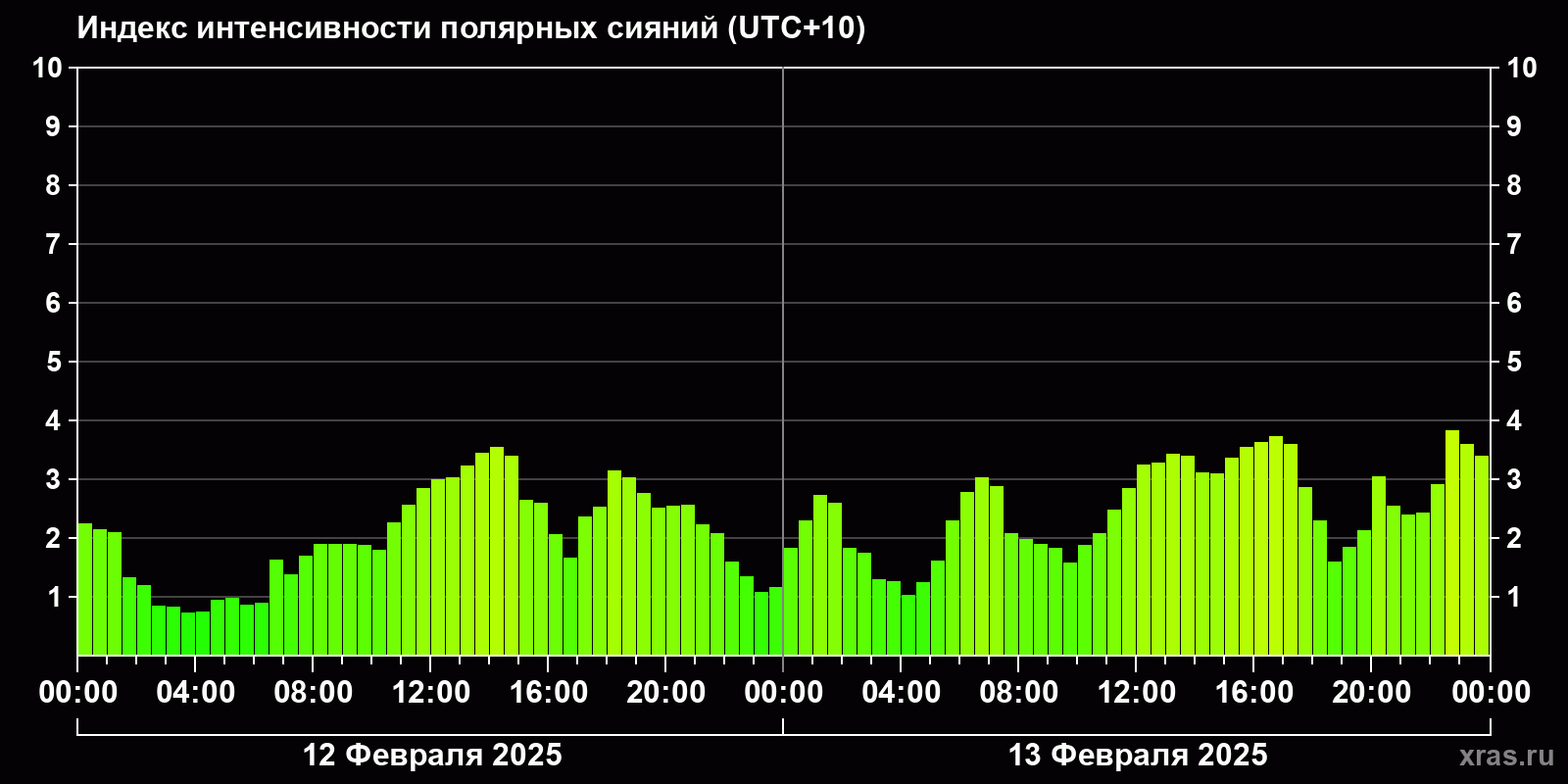 Изменения индекса интенсивности полярных сияний с 2025-02-12 по 2025-02-13 по местному времени