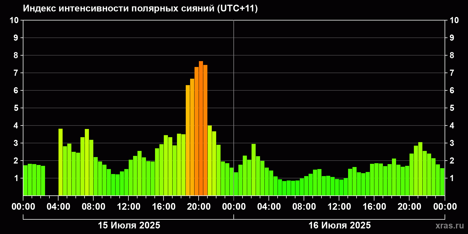 Изменения индекса интенсивности полярных сияний с 2025-07-15 по 2025-07-16 по местному времени