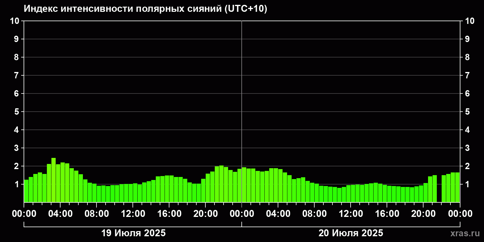 Изменения индекса интенсивности полярных сияний с 2025-07-20 по 2025-07-21 по местному времени