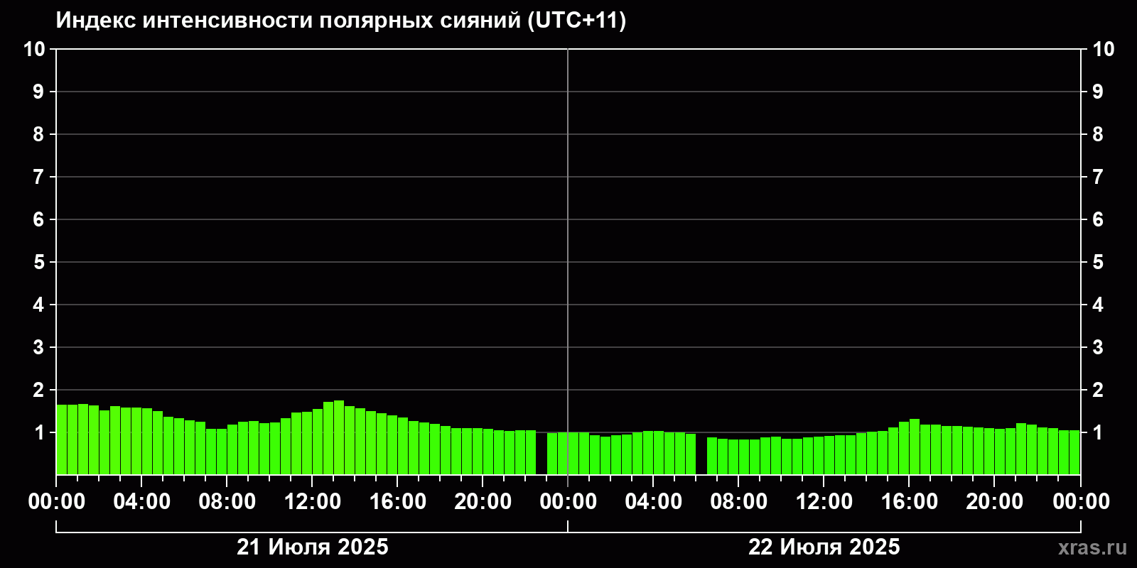 Изменения индекса интенсивности полярных сияний с 2025-07-21 по 2025-07-22 по местному времени
