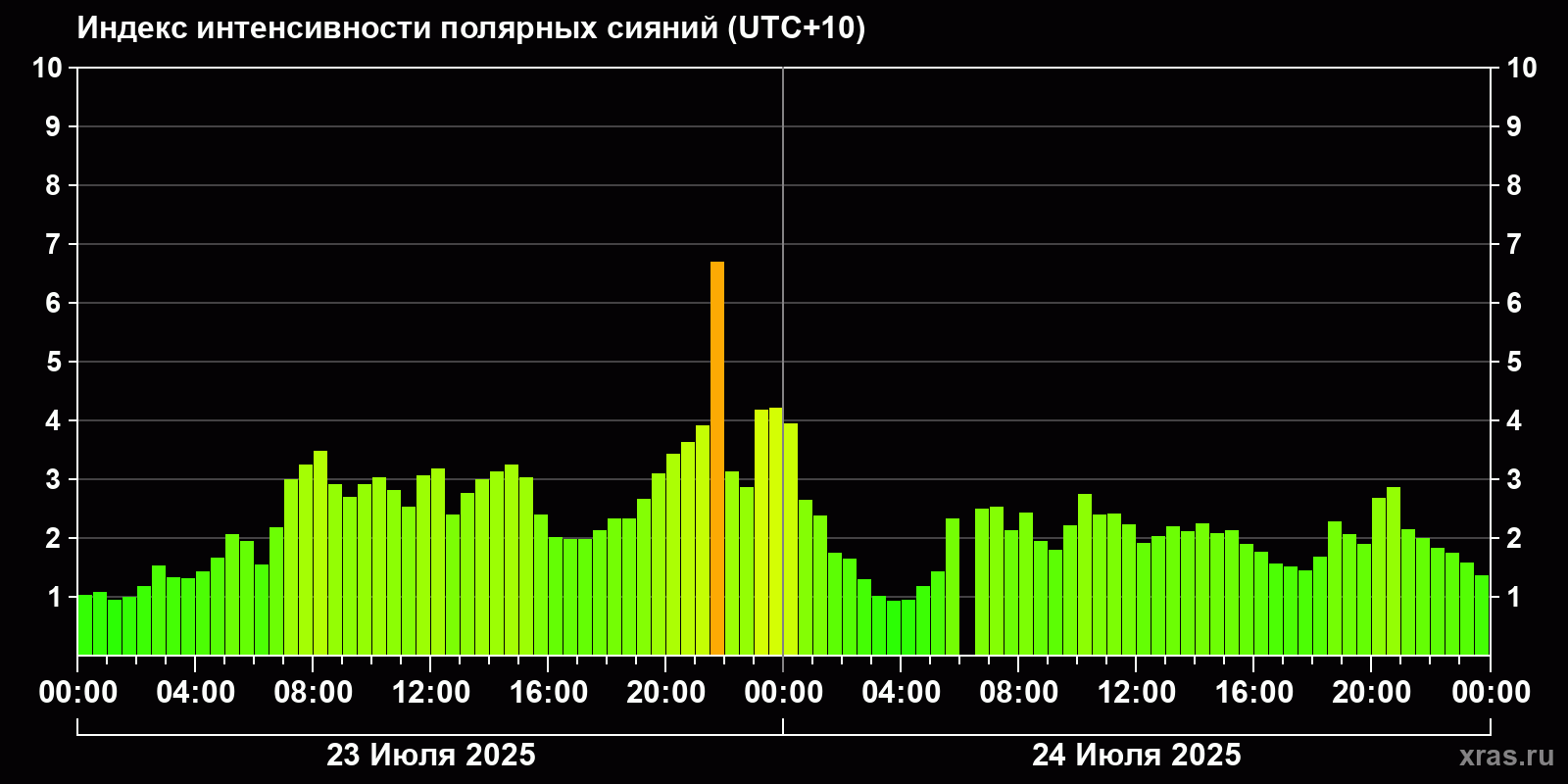 Изменения индекса интенсивности полярных сияний с 2025-07-23 по 2025-07-24 по местному времени